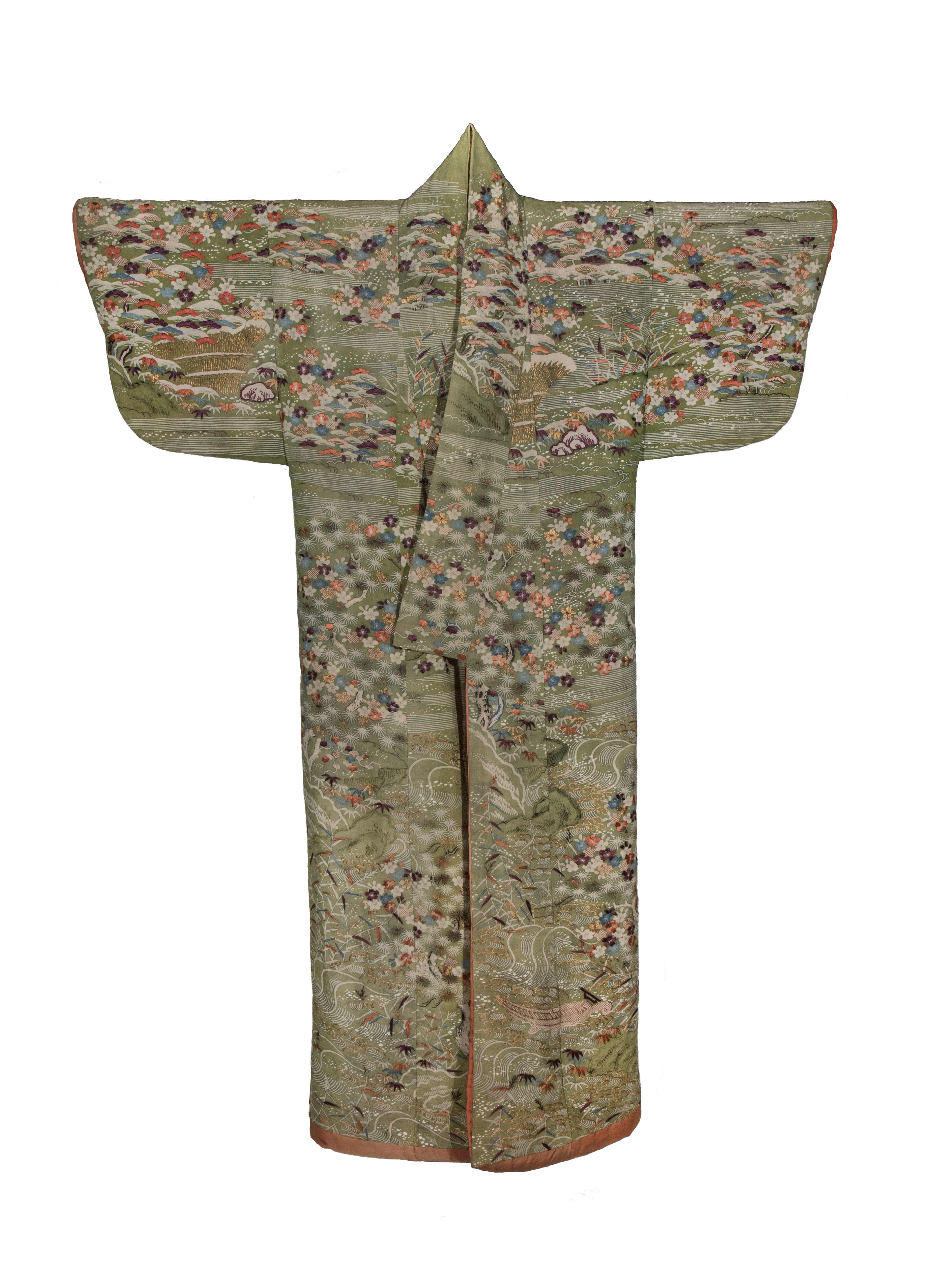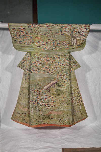 Crespo di seta tinto a riserva, ricamato e decorato con applicazione di oro cartaceo. Costruzione del tessuto: 1 ordito di fondo, seta verde (bianca per riserva), 50 fili/cm, 1 trama di fondo, seta verde (bianca per riserva), 25 colpi/cm. Armatura: taffetà con effetto ondato ottenuto dalla forte torsione in direzione S e Z dei fili di trama in doppia alternanza: 2 colpi in direzione S e due colpi in direzione Z. Ricamo a punto lanciato in seta floscia policroma nei colori: viola, arancione, nero, bianco e azzurro. Applicazione di oro cartaceo su anima di seta bianca legato al tessuto da filo di seta bianca, tintura a mascherina. Motivo decorativo: paesaggio innevato con oggetti di uso quotidiano (E. de Concini)