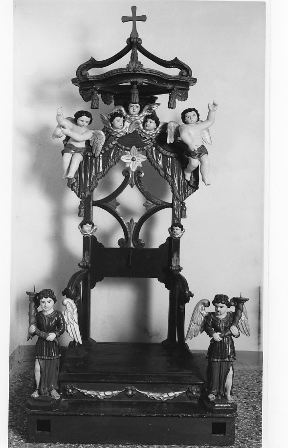 Baldacchino da processione con angeli reggi candelabro alla base e altre figure angeliche. Sulla sommità, corona apicale con croce. Al centro dello schienale un fiore a 4 petali. Presenza di fiori e festoni alla base