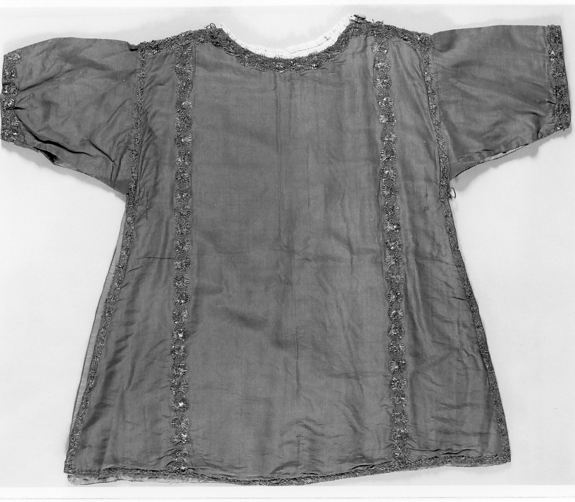 Dalmatica con rifiniture lungo i bordi delle maniche, del collo e in fondo. La stessa rifinitura è posta su due linee verticali per tutta la lunghezza della veste