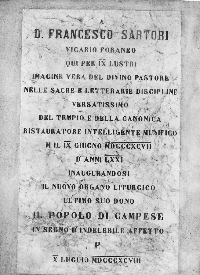 - ISCRIZIONI centrale alla lapide - A/ D. FRANCESCO SARTORI/ VICARIO FORANEO/QUI PER IX LUSTRI/ IMAGINE VERA DEL DIVINO PASTORE/ NELLE SACRE E LETTERARIE DISCIPLINE/ VERSATISSIMO/ DEL TEMPIO E DELLA CANONICA/ RISTAURATORE INTELLIGENTE MUNIFICO/ M. IL IX GIUGNO MDCCCXCVII/ D'ANNI LXXI/ INAUGURANDOSI/ IL NUOVO ORGANO LITURGICO/ ULTIMO SUO DONO/ IL POPOLO DI CAMPESE/ IN SEGNO D'INDELEBILE AFFETTO/ P./ X LUGLIO MDCCCXCVIII - lettere capitali -