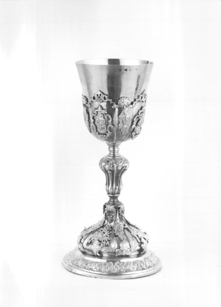 PIEDE: A SEZIONE CIRCOLARE. FUSTO: NODO PIRIFORME CON FASCIE SCANALATE. SOTTOCOPPA: QUATTRO MEDAGLIONI MISTILINEI APPLICATI CHE RACCHIUDONO QUATT R O FIGURE UMANE ANCH'ESSE APPLICATE. DECORAZIONE: FOGLIE D'ACANTO, FESTO NI CON GRAPPOLI E TRALCI D'UVA RIPETUTI NEL PIEDE E NEL SOTTOCOPPA, TEST INE ANGELICHE, EMBLEMI DELLA PASSIONE APPLICATI NEL PIEDE. PROFILO DEL S OTTO COPPA A VOLUTE