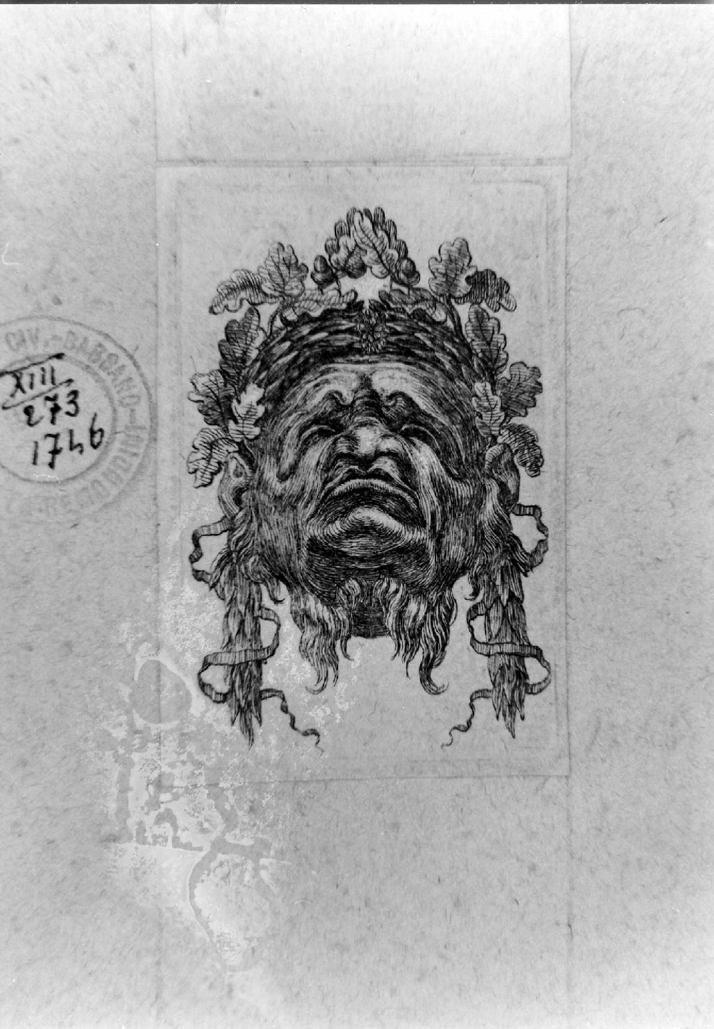 Decorazioni: maschera di baccante. Parti anatomiche: volto; bocca; naso; barba; occhi. Vegetali: foglie di quercia