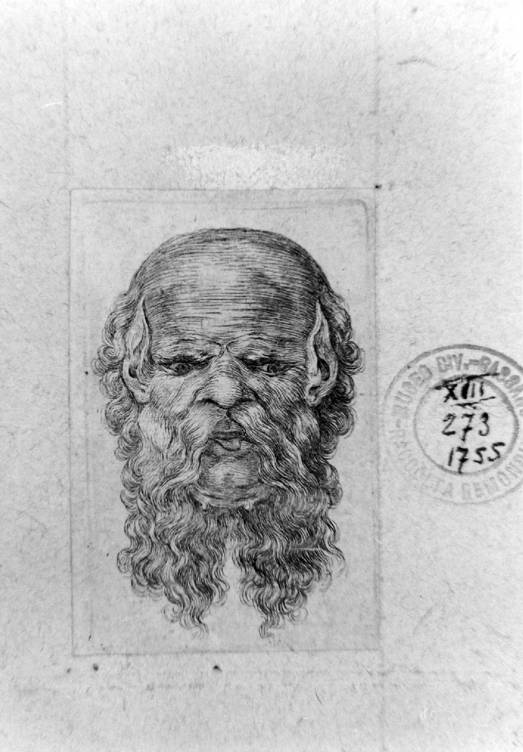 Decorazioni: maschera di satiro. Parti anatomiche: volto; bocca; naso; occhi; baffi; barba