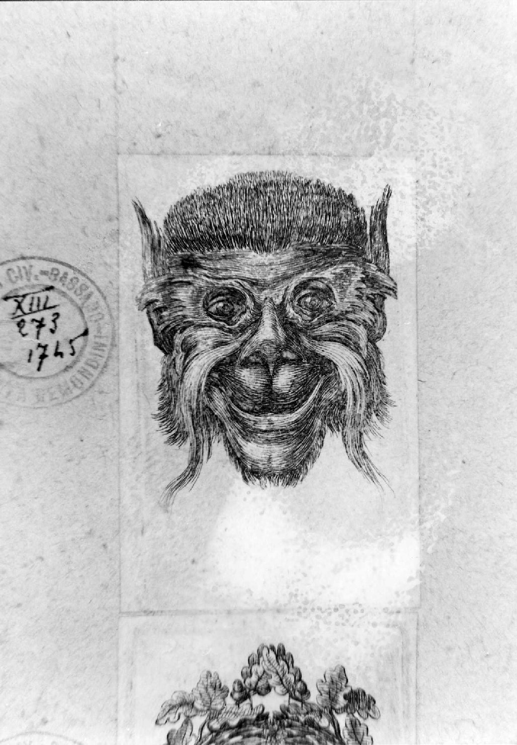 Decorazioni: maschera di satiro. Parti anatomiche: pelo; volto; bocca; naso; ciglia; occhi
