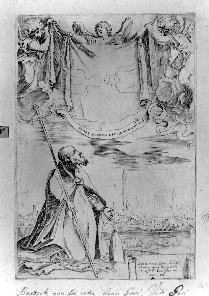 - NOTIZIE STORICO CRITICHE La stampa è stata ritoccata nella parte alta delle mura della città con delle linee orizzontali. Falsamente attribuita a Annibale Carracci. La figura maschile per alcuni critici è l'arcivescovo Alfonso Paleotti, per altri il vescovo e patrono di Bologna San Petronio (Birke 1987)