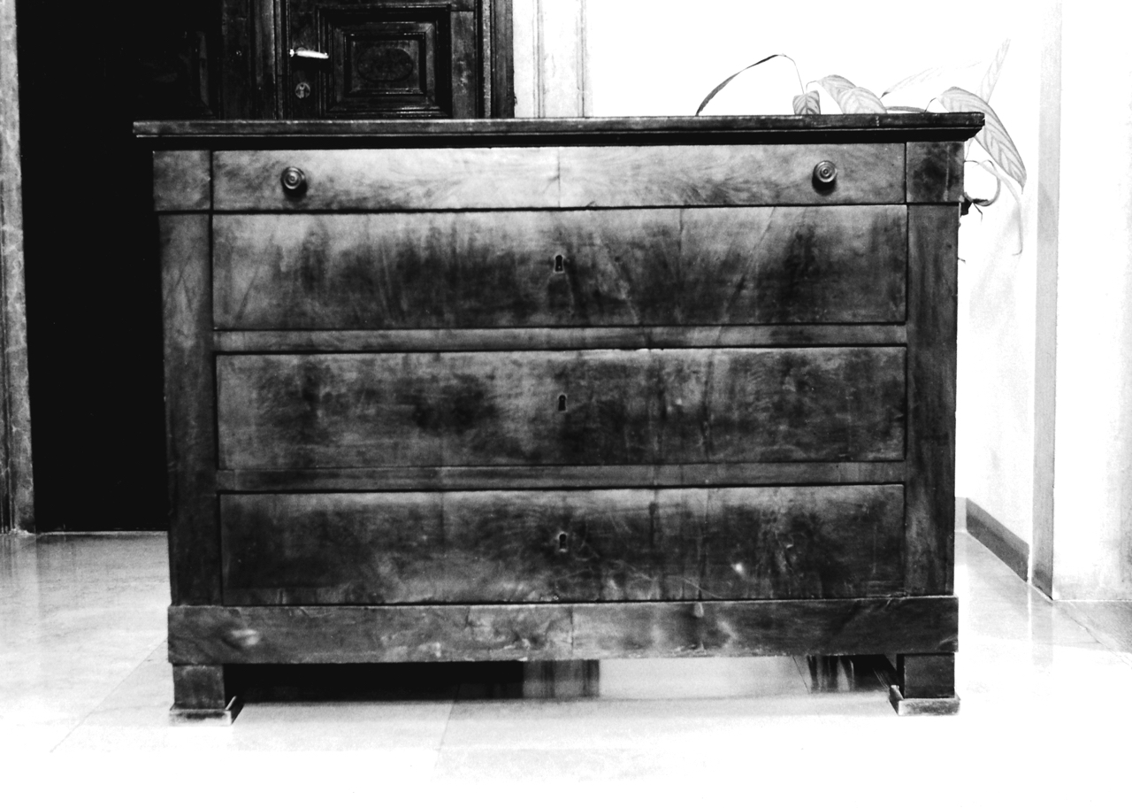 cassettiera a quattro cassetti di cui quello superiore di dimensioni inferiori, con pomelli in legno torniti. Riporta i marchi: C.corona R.P. 618 - 2597 - ML - stemma sabaudo