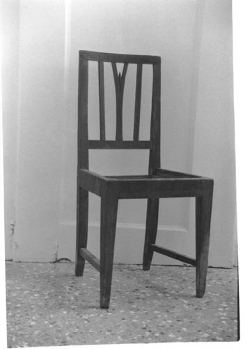 sedia in legno con grosse gambe tronco-piramidali unite da traverse, fascia del sedile dritta, schienale a giorno quadrangolare con due traverse unite da tre elementi verticali di cui quello centrale biforcuto