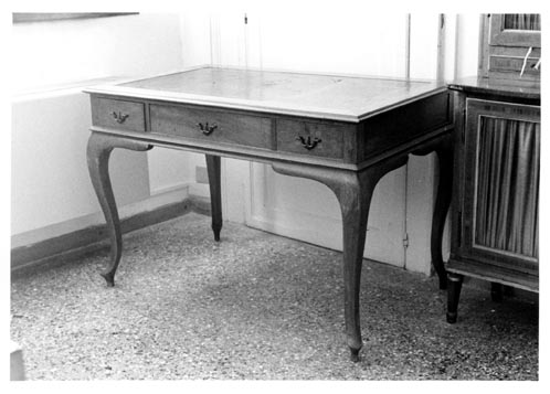 tavolino a funzione di scrittoio di forma quadrangolare, con gambe a capriolo, base del piano con tre cassetti, piano con inserito un supporto in finto cuoio