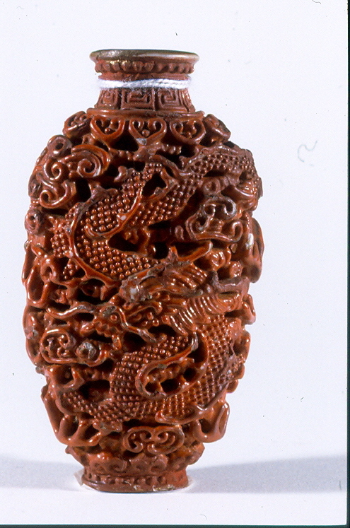 Tabacchiera yanhu dal corpo piriforme schiacciato a sezione ellittica, con breve collo e bocca piatta e svasata