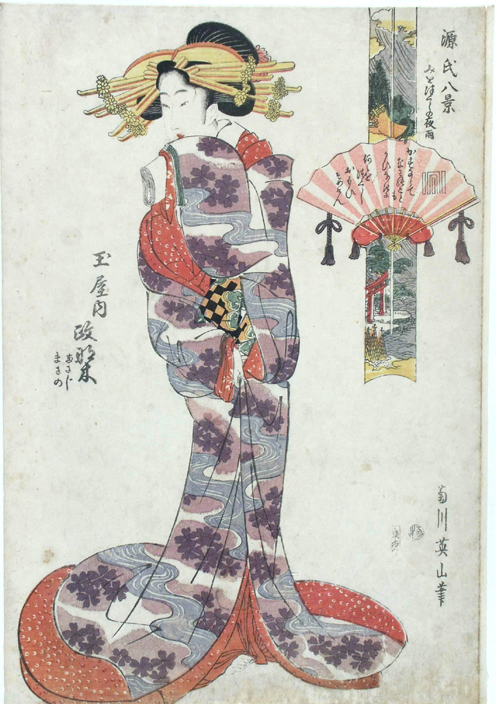 - NOTIZIE STORICO CRITICHE Di questa serie si conoscevano finora solo la presente stampa e la 00275560. Tuttavia nel Cleveland Museum of Art è conservata una terza stampa intitolata Hashihime yusho (Splendore serale del cielo a Hashihime), raffigurante la cortigiana Aizome della casa verde Ebiya, mentre in occasione della mostra Il mondo di Eizan, Venezia 1989, furono presentate anche Suma shugetsu, Hana chiru sato no seiran e Ukifune rakugan, conservate nel Museo d'Arte Orientale di Venezia. In questo modo sono state ritrovate sei stampe delle otto che dovrebbero costituire la serie. Il tema delle otto vedute originariamente si riferiva ai meravigliosi paesaggi intorno al lago Dotei in Cina, chiamati "Otto vedute di T'u-siao-siang, " e raffigurati frequentemente neii dipinti cinesi ad inchiostro. Più tardi anche in Giappone si iniziòa scegliere otto vedute eccellenti fra i luoghi famosi dell'arcipelago. Gli otto paesaggi intorno al lago Biwa nella provincia di Omi, scelti da Konoe Masaie e da suo figlio Naomichi nel 1500 per le loro poesie, sono i più famosie più divulgati e costituiscono un tema ricorrente nei dipinti e nelle stampe dell'ukiyoe. Di solito sono riportate anche le poesie riguardanti i diversi luoghi per creare un'atmosfera poetica e letteraria. Nella presente serie i temi delle otto vedute - bosetsu (neve al crepuscolo), kihan (ritorno delle barche), shugetsu (luna autunnale), sekisho (splendore serale del cielo), bansho (campane serali), seiran (foschia in una bella giornata), rakugan (discesa delle oche selvatiche) e yau (pioggia notturna) - vengono collegati con le scene della Storia del principe Genji (Genji monogatari), celebre romanzo scritto da Murasaki Shikibu (976-1016). Le scene sono disegnate su un ren (asse di legno usato come supporto per un dipinto o una calligrafia che si appende su un pilastro o su una parere) che funge da vignetta, su cui è appeso un ventaglio che reca una delle poesie del romanzo