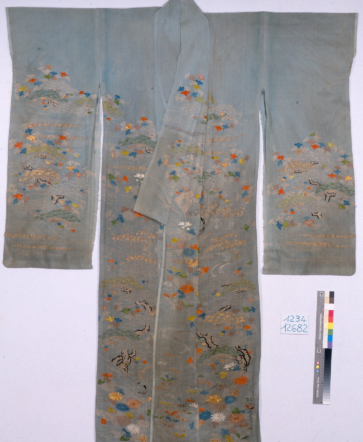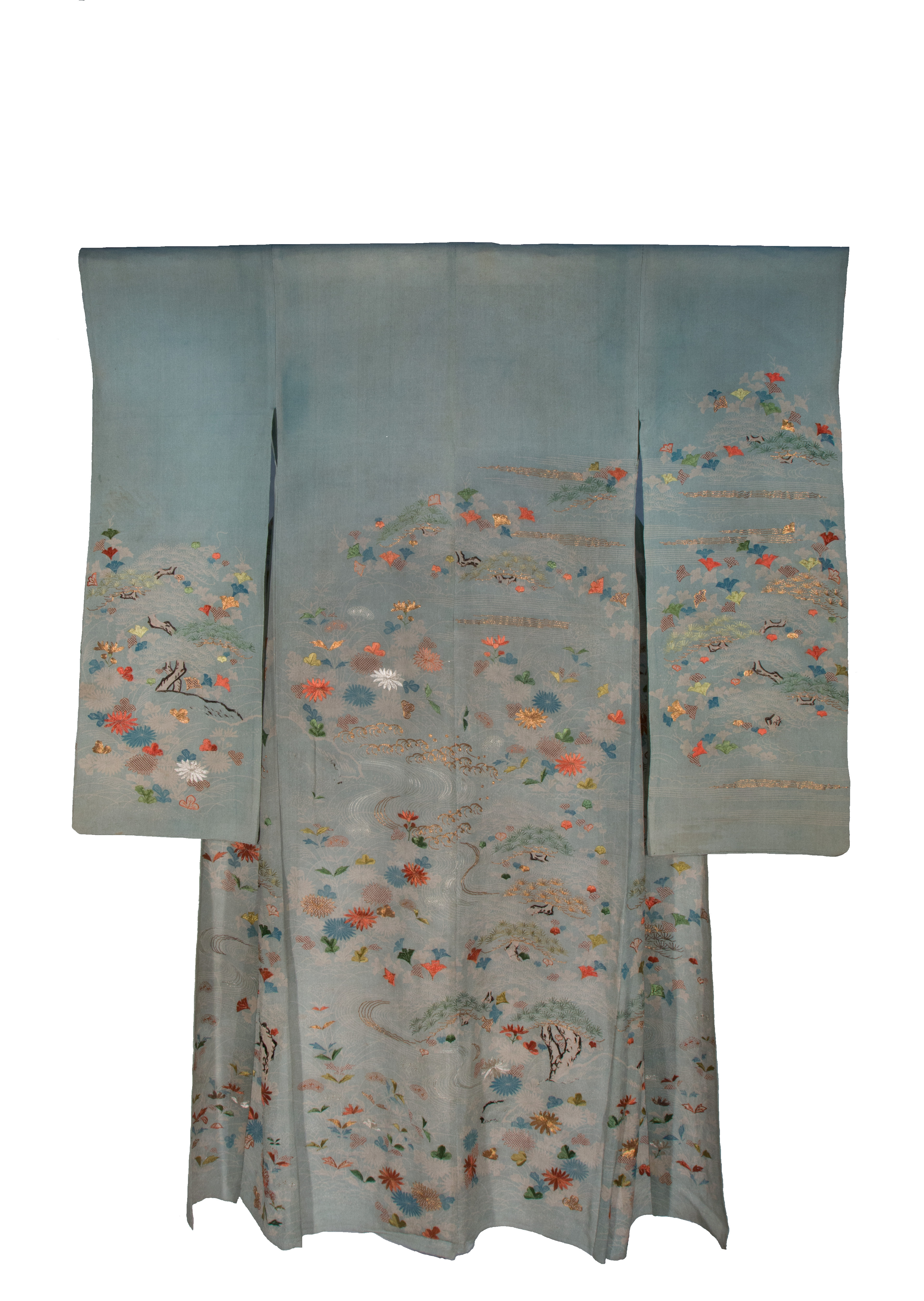 Furisode in crespo di seta, tinto in azzurro, decorato a mascherina, ricamato e con applicazioni di filo d'oro e d'argento. Ordito: 1, seta, bianco (per riserva), 56 fili/cm. Trama: 1, seta, bianco (per riserva), 22 colpi/cm, forte torsione S e Z alternata. Costruzione del tessuto: tela con effetto ondato per la forte torsione delle trame. Opera per tintura a riserva, tintura a mascherina, ricamo in seta floscia policroma nei colori: verde (chiaro e scuro), mattone, nero e bianco. Punti utilizzati: punto lanciato e punto pittura. Applicazione di oro cartaceo e applicazione di argento cartaceo su anima di seta bianca fissati entrambi con filo di seta arancione. Motivo decorativo: paesaggio roccioso con onde, acqua, nebbia e vegetazione floreale (E. de Concini)