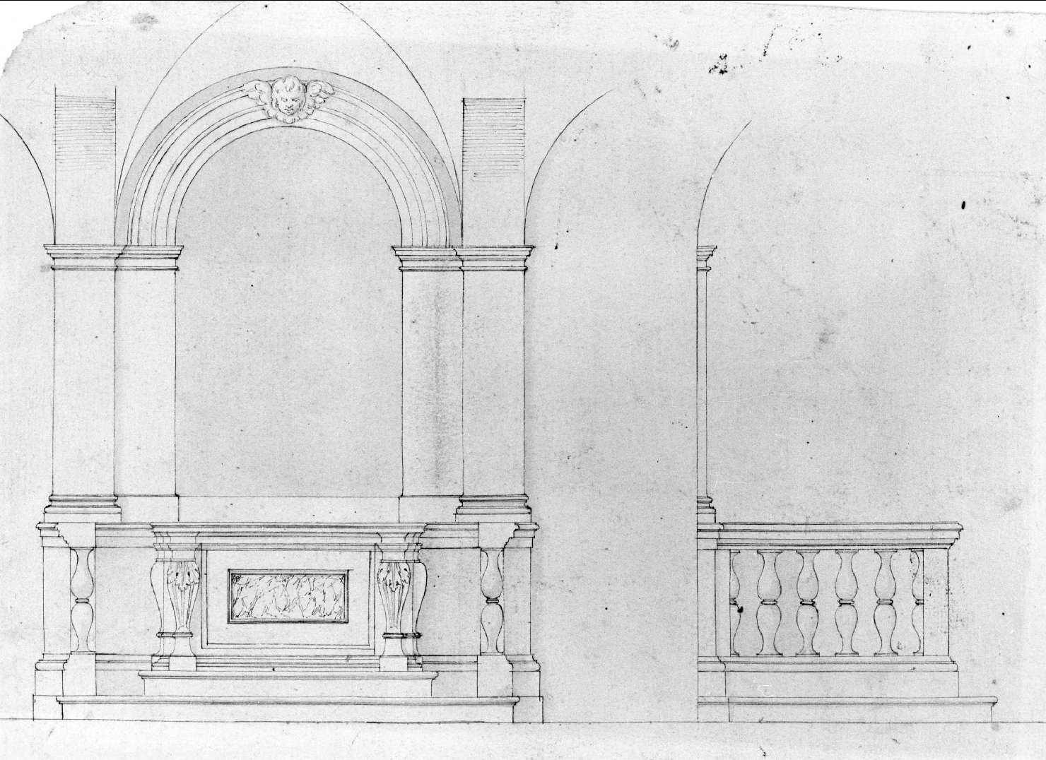 Disegno a penna e inchiostro bruno, acquerello bruno, con prospetto e fianco di altare. Il foglio reca una filigrana con "3 M". Sul verso è presente un'altra figurazione (si veda la scheda 00280957A)