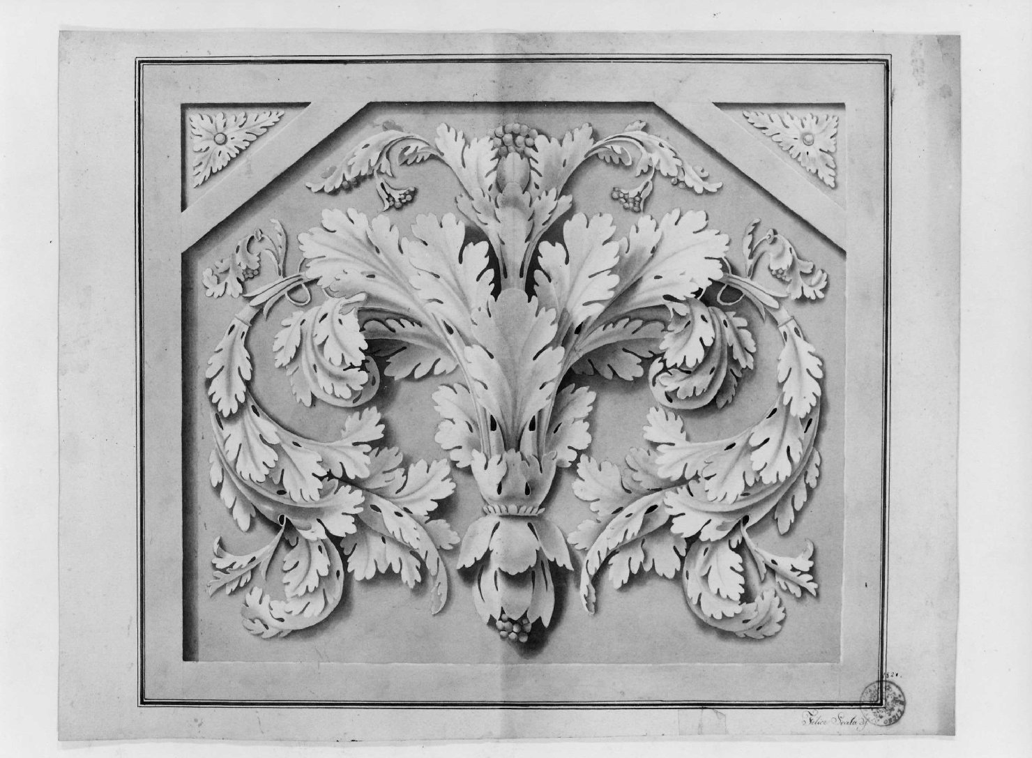 Disegno di ornato a racemi vegetali realizzato a matita nera, penna, inchiostro grigio e nero, acquerello grigio. Sul verso è incollato un cartoncino con il numero di inventario