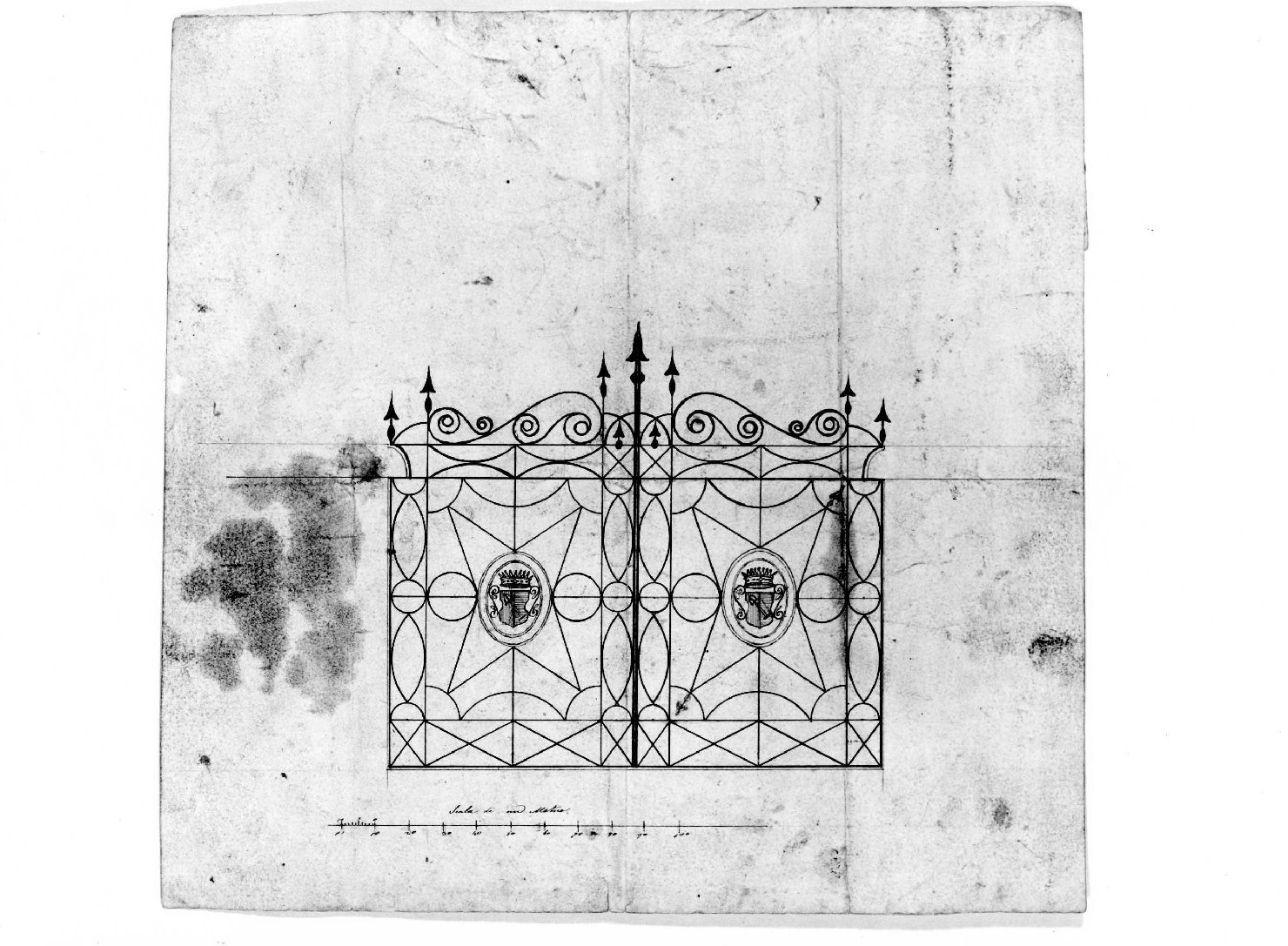 Disegno a matita nera, penna e inchiostro bruno con studio per cancello in ferro con stemmi. Sul verso è incollato un cartoncino con il numero di inventario