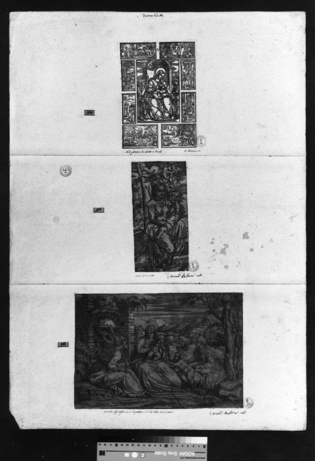 - NOTIZIE STORICO CRITICHE Sul cartone sono incollate le stampe n. 120-122. A sin. di ciascuna incisione è applicato un bollino rettangolare azzurro con impresso il vecchio numero d'inventario (100-102) barrato a matita rossa
