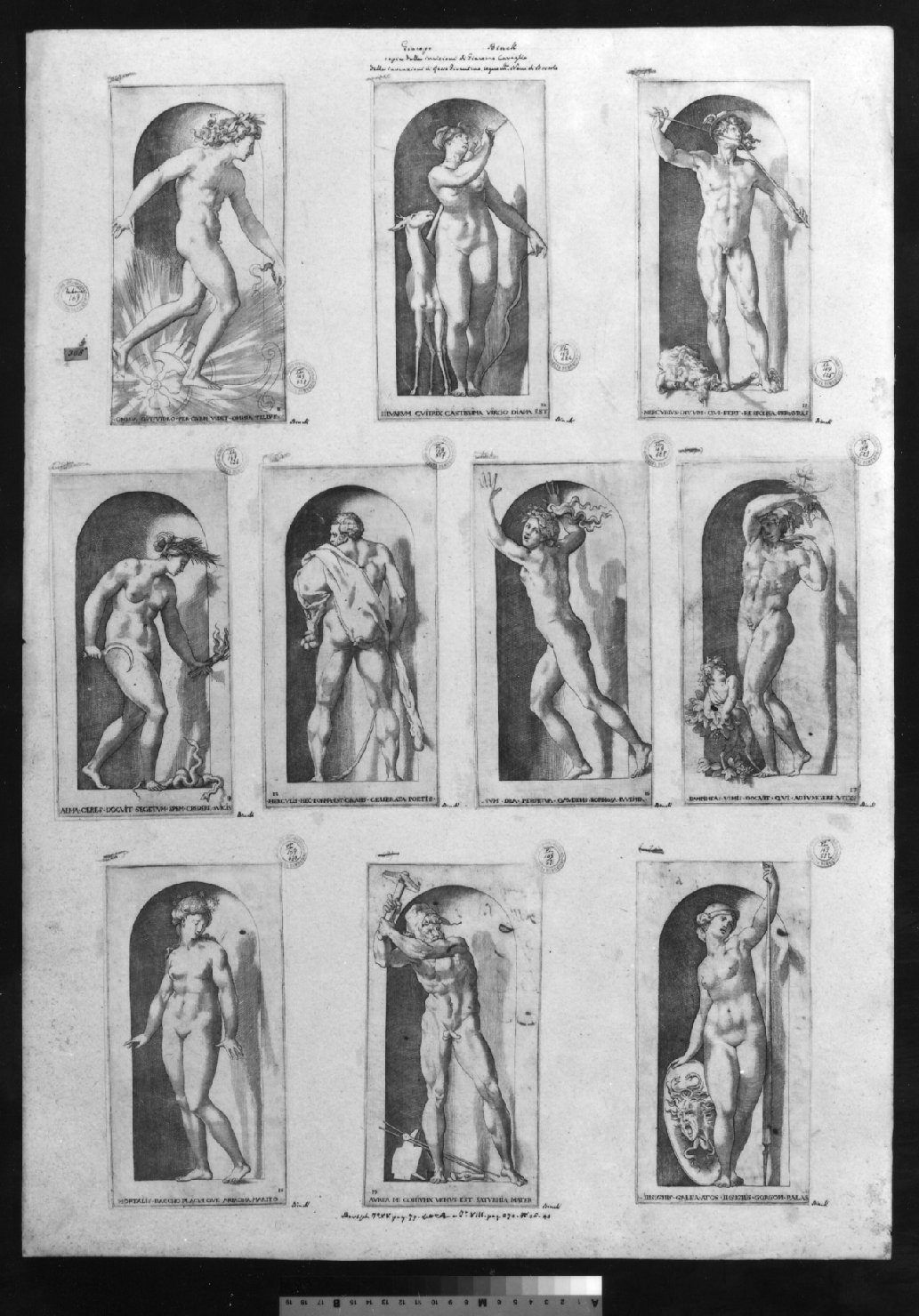 - ISCRIZIONI in alto al centro - Giacopo Binck/ copia delle incisioni di Giacomo Caraglio/ dalle invenzioni di Rosso Fiorentino cognom.to Nani di Bartolo - corsivo - a penna -