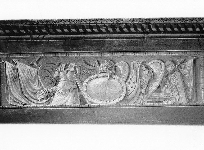 Dipinto monocromo con elmo, scudi, fascio littorio, loriche, faretra