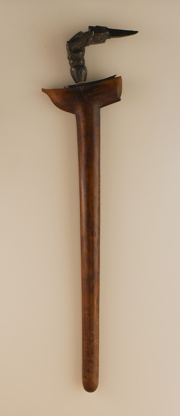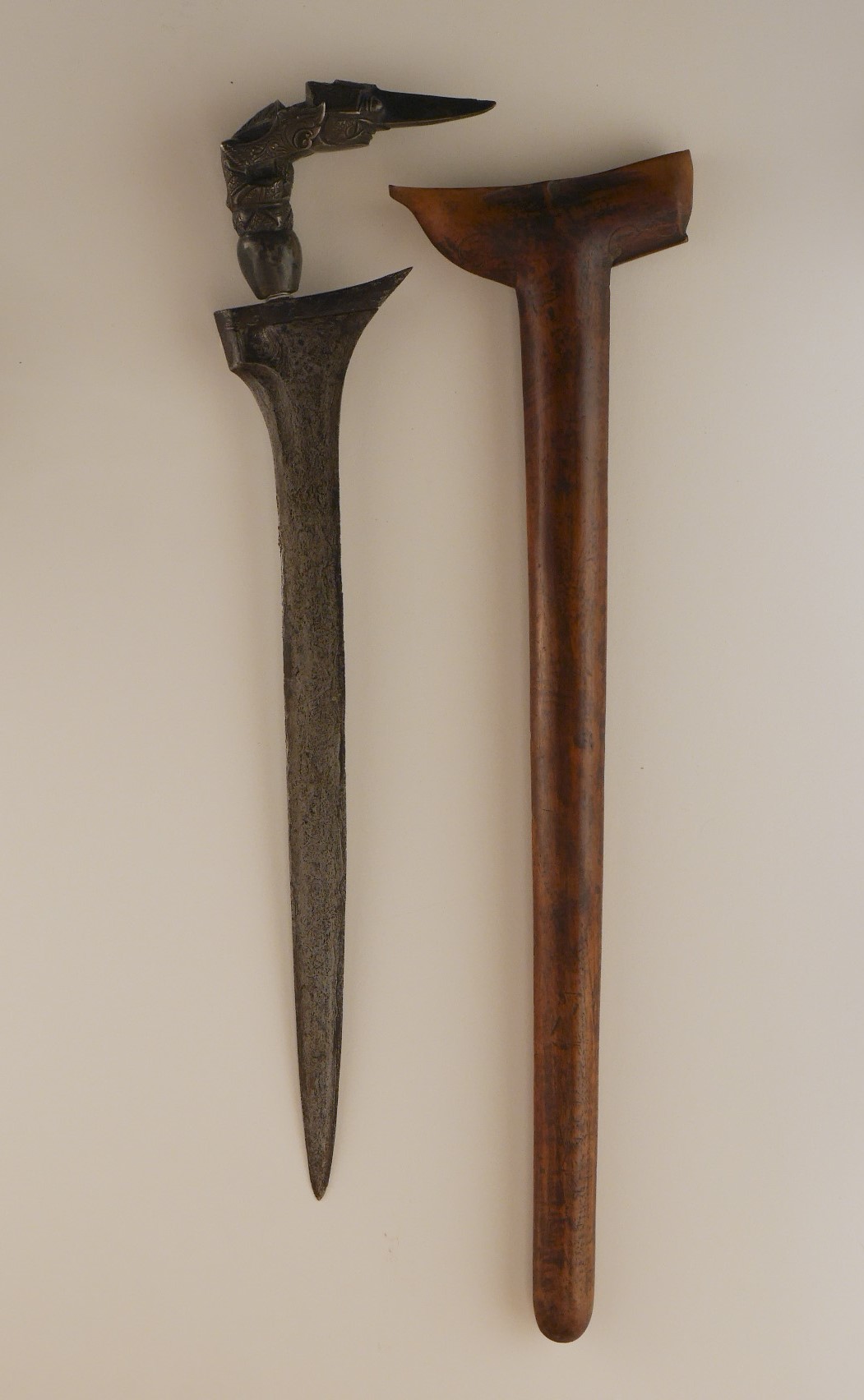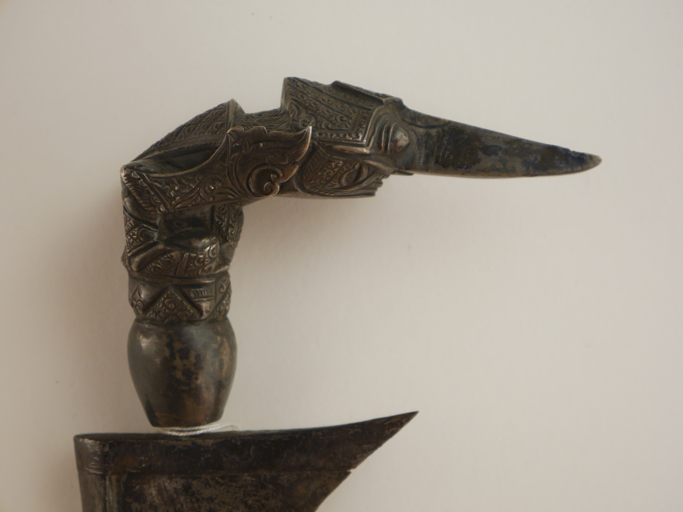 Keris di tipo coteng completo di fodero e realizzato secondo lo stile caratteristico della provincia di Songkhla, situata nel sud della Thailandia. L'impugnatura, realizzata in metallo – probabilmente lega d'argento – è di tipo pekaka, e rappresenterebbe la divinità Garuda, veicolo divino, resa con grande astrazione e profonda enfatizzazione dei tratti fisici. Si notino i particolari delle braccia conserte, dei grandi occhi sporgenti, delle zanne ricurve e del lungo naso appuntito; la figura si presenta seduta su un trono di tipo tumpal dalla tipica decorazione a triangoli contrapposti. Il dapor (forma) della lama è di tipo tilam upih, ed è realizzata in acciaio damasco dal lieve contrasto. Il fodero, molto lungo e realizzato in legno chiaro, reca dei sottili decori incisi nella parte superiore (warangka, destinata a coprire l'elsa) ed ha la particolarità di essere di tipo iras, quindi realizzato non in due parti, come solitamente accade, ma con un'unica porzione di legno