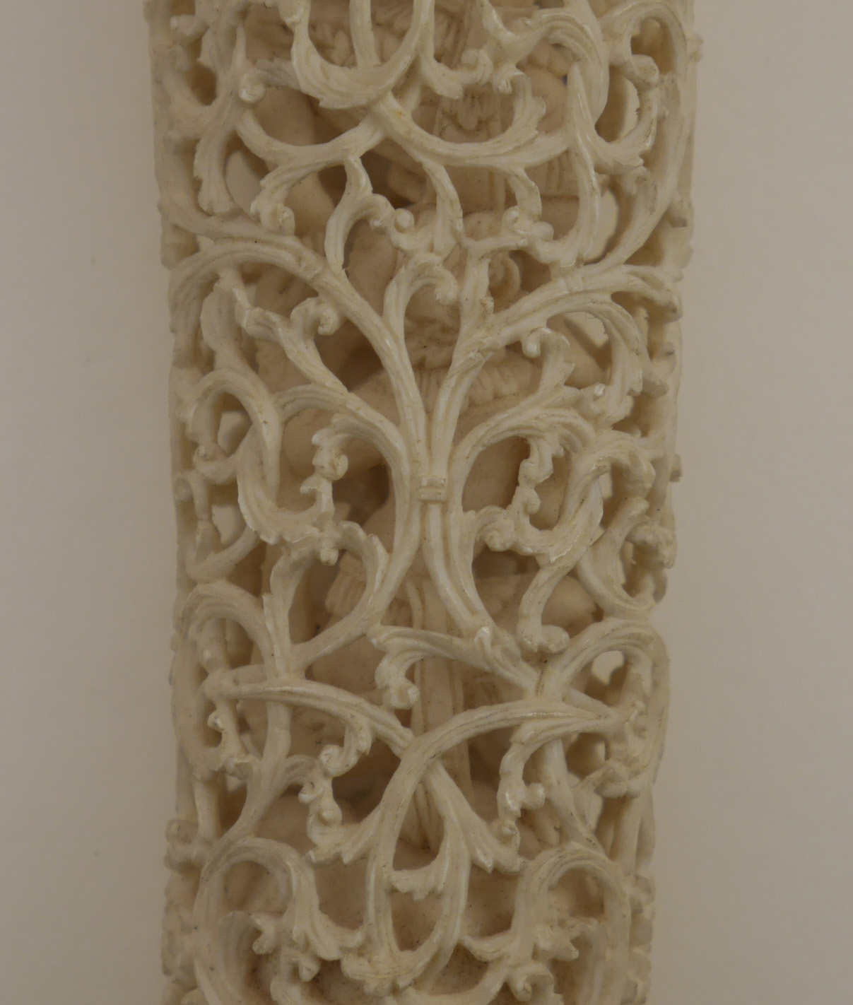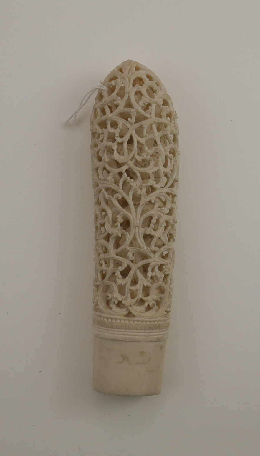 Impugnatura di qualità particolarmente elevata di dha-hmyaung proveniente da Myanmar (Birmania). È realizzata in avorio di elefante sulla cui superficie si riconoscono le caratteristiche linee di accrescimento dette di Retzius o Schreger; mostra due figure in armi, probabilmente divinità, una sovrastante l'altra ed entrambe avvolte da uno strato esterno traforato in forma di volute fitomorfe. Alla base è assente il foro destinato al codolo della lama