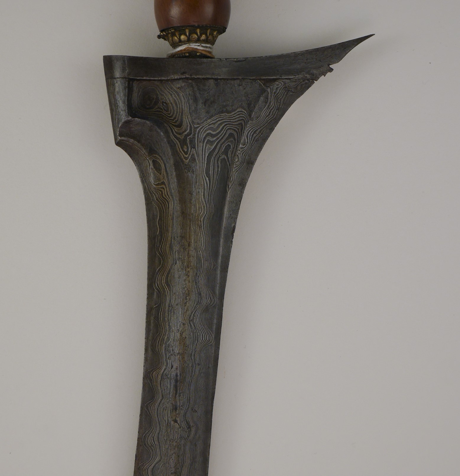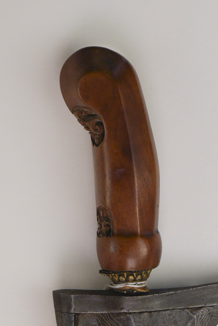 Keris privo di fodero proveniente da Yogyakarta, Giava centrale. L'impugnatura (chiamata specificatamente deder o djedjeran a Giava) è di tipo nunggaksemi ed è realizzata in legno dalle splendide venature e dal colore caldo e profondo, probabilmente tayuman (Cassia Laevigata Willd.); reca due patra, complicate decorazioni in forma di maschera, scolpite in profondità. L'elemento ad anello – mendak – sul quale poggia l'impugnatura è di tipo paryoto, esempio rappresentativo del canone stilistico della regione di Yogyakarta. La lama è dritta (lurus), ha una forma (dapur) di tipo tilamsari molto ben definita ed è caratterizzata da spigoli netti e taglienti e da profonde nervature al forte (pejetan e tikel alis). È realizzata in acciaio stratificato (acciaio damasco) dal piacevole contrasto e dal disegno della damaschinatura (pamor) di tipo untu walang: è un tipo di pamor la cui lavorazione viene preventivata dall'empu – maestro forgiatore – durante la lavorazione (rekan) e gli viene attibuito un potere talismanico talmente importante da renderlo un pamor non adatto a tutti, in quanto un keris, per apportare benefici alla vita del proprietario, deve essere scelto perchè compatibile con la psiche dello stesso. La ganja, elsa, è interessata da una leggera dentellatura (greneng) ed è detta wulung perchè realizzata in acciaio semplice e non laminato come quello che compone la lama