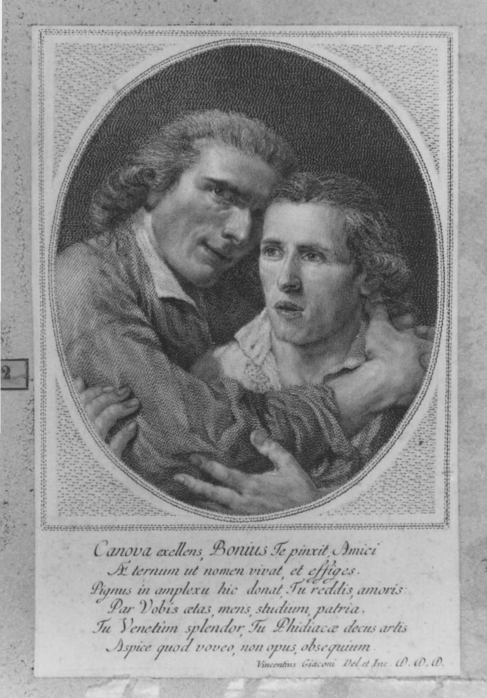 - ISCRIZIONI in basso - Canova exellens. Bonius Te pinxit. Ammici/ AEternum ut nomenvivat. Et effiges. Pignus in amplexu hic donat Tu reddis, amoris:/ Par Vobis aetas, mens, studium, patria. Tu Venetium splendor. Tu Phidiacae decus artis/ Aspice quod voveo, non opus, obsequium./ Vincentius Giaconi Del. Et Inc. D.D.D - corsivo - a inchiostro -