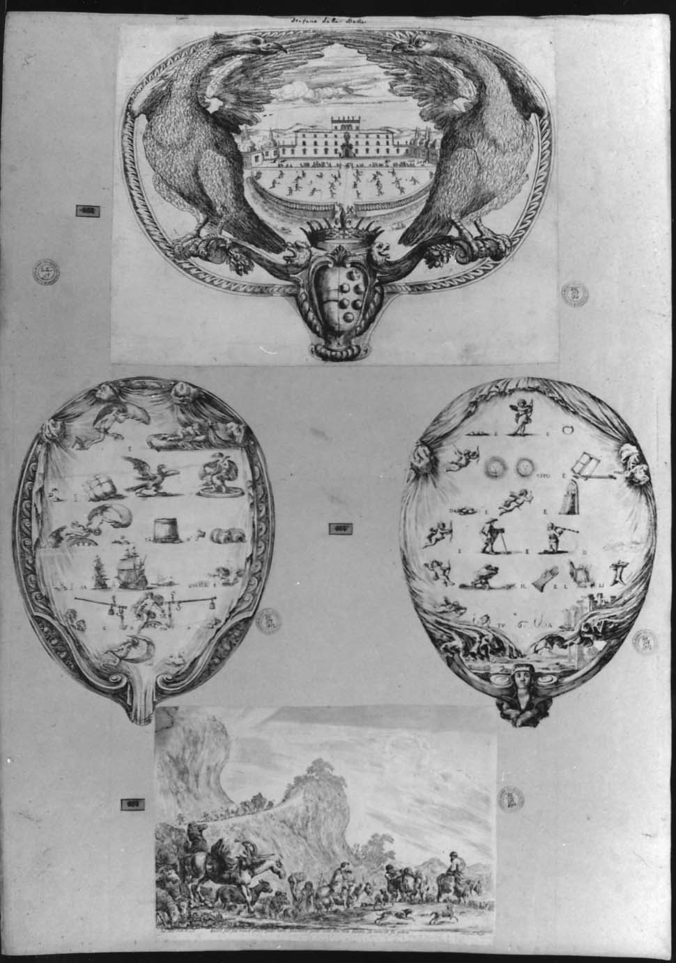 - NOTIZIE STORICO CRITICHE Sul cartone sono incollate le seguenti stampe: nn. inv. 1711/ 1712/ 1713/ 1714. A sinistra di ciascuna incisione si trova un bollino rettangolare azzurro con impresso il vecchio numero d'inventario barrato a matita rossa: 603/ 604/ 605. I fogli n. 1712 e 1713 recano un solo bollino azzurro, il n. 604