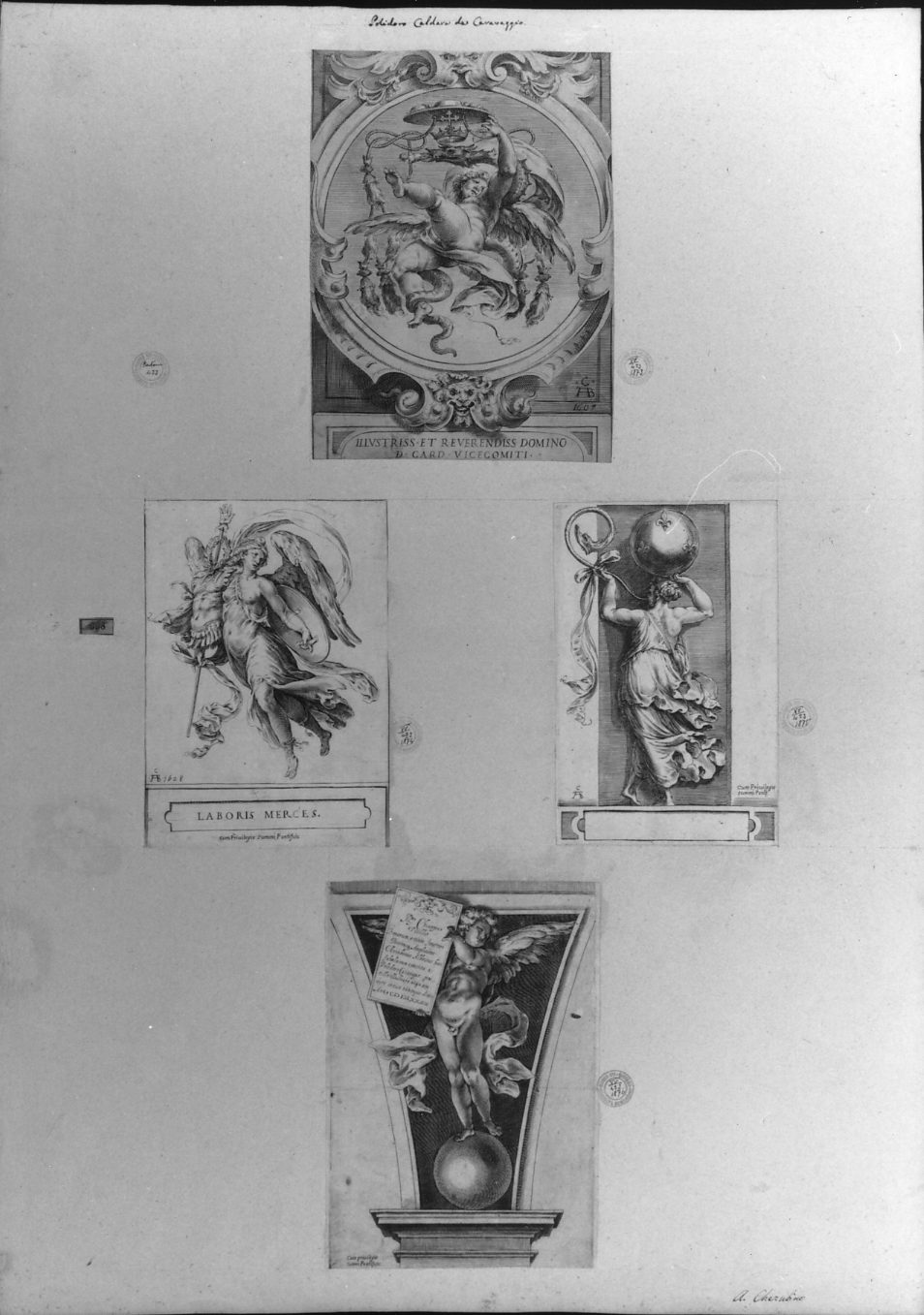 - NOTIZIE STORICO CRITICHE Sul cartone sono incollate le stampe nn. inv. 1873/ 1874/ 1875/ 1876. Tra i fogli c'è un bollino azzurro con impresso il vecchio numero d'inventario barrato a matita rossa: 698