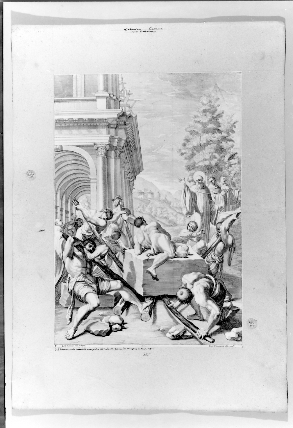 - ISCRIZIONI sotto la stampa n.2221 - 7. Il demonio rende immobile una pietra destinata alla fabbrica del Monast ero di Monte Cassino - corsivo - a penna -