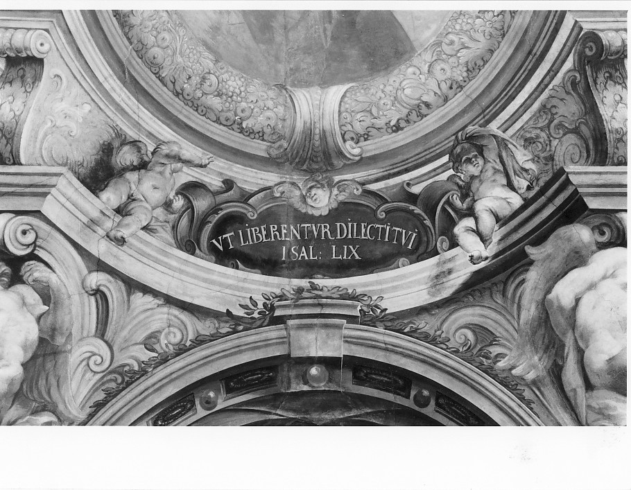 Dipinto con finte architettute, putti, testine alate, motivi decorativi a festoni e vegetali con iscrizione