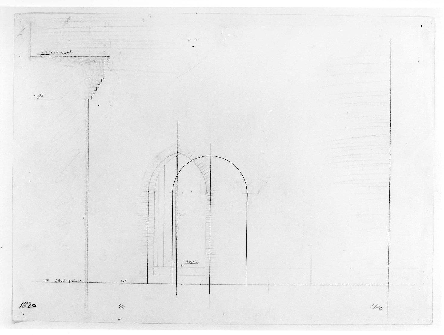 - ISCRIZIONI sul foglio - 5,13 camminamento / 0,00 attuale pavimento / 34 Mastio - corsivo/ numeri arabi - a matita -