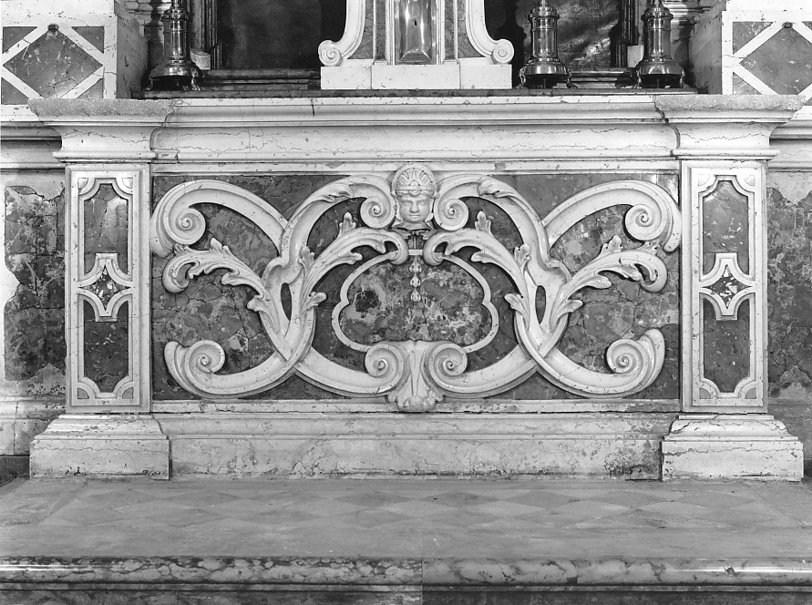 Mensa d'altare con paliotto con decorazioni in rilievo a volute e girali vegetali con testina al centro
