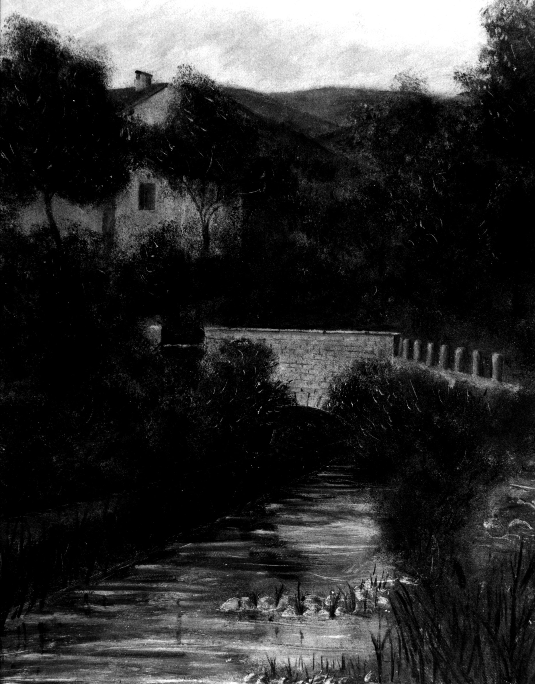 Paesaggio di Caprino Veronese. paesaggio con ponte, alberi, casa e colline