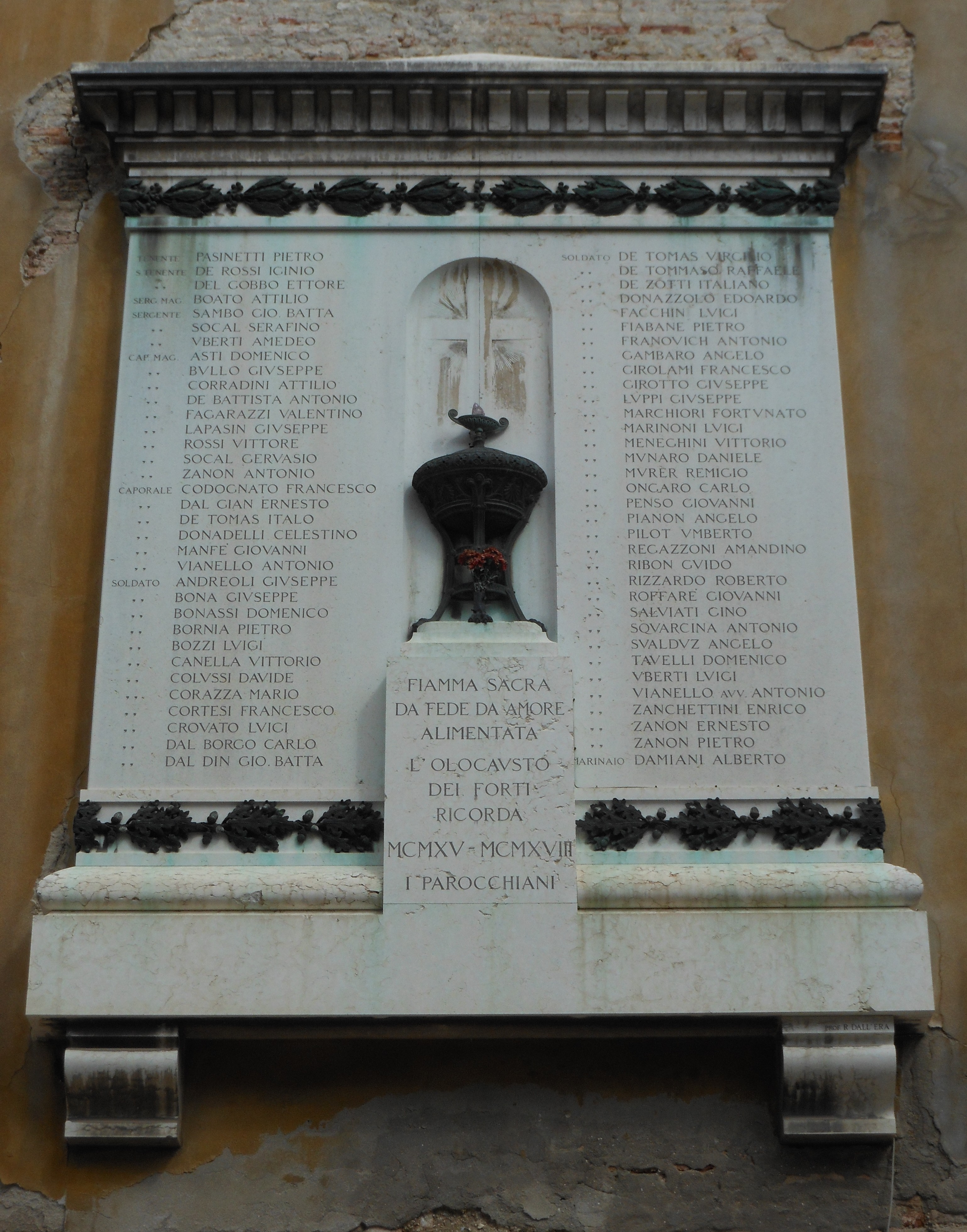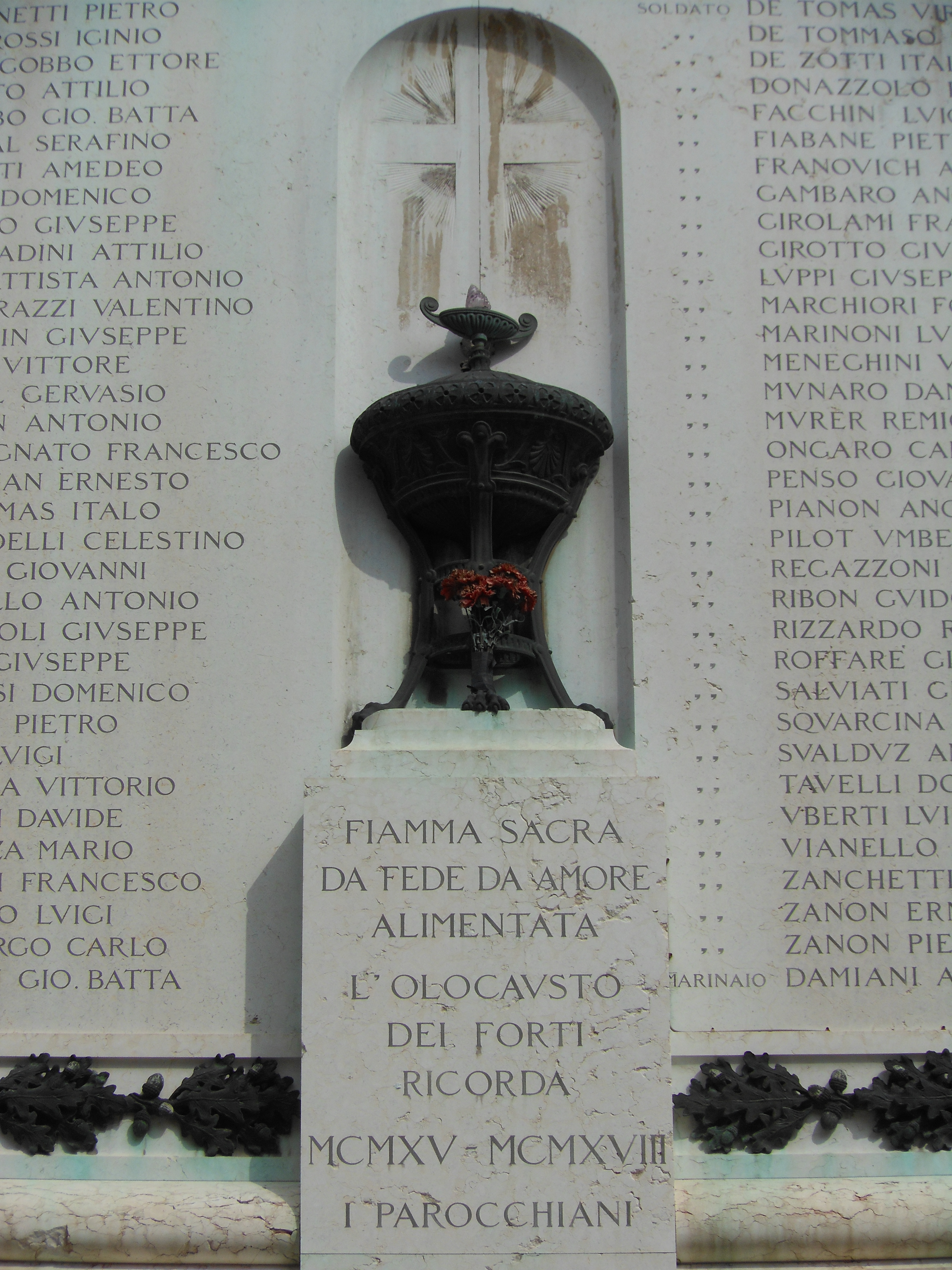 - ISCRIZIONI centrale - FIAMMA SACRA/ DA FEDE DA AMORE ALIMENTATA/ L'OLOCAVSTO/ DEI FORTI/ RICORDA/ MCMXV - MCMXVIII/ I PAROCCHIANI - lettere capitali e numeri romani - a niello -