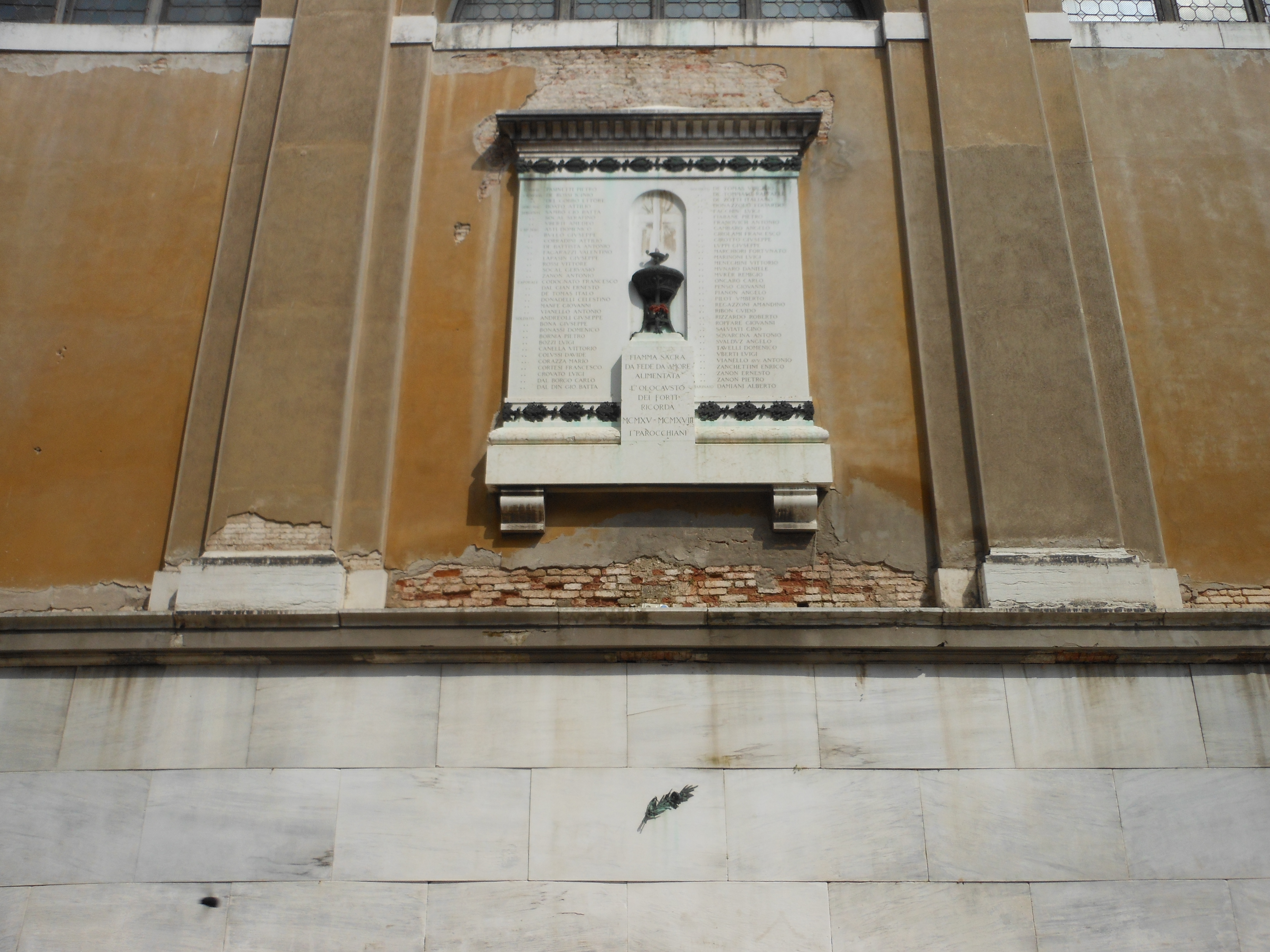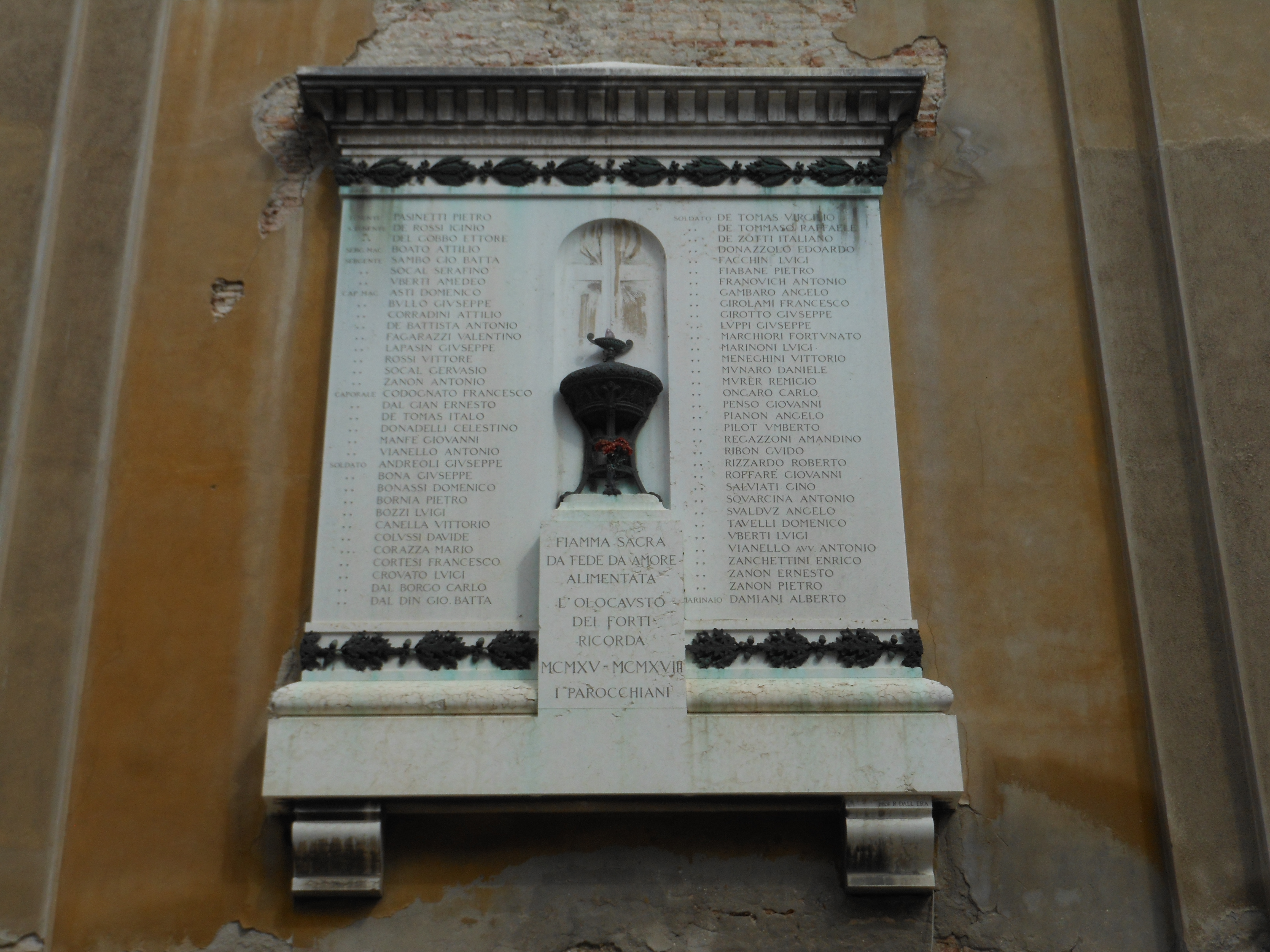 - NOTIZIE STORICO CRITICHE L'opera venne commissionata e finanziata dalla comunità parrocchiale di San Cassiano, a ricordo dei propri caduti durante la Prima Guerra Mondiale (1915-1918). La lapide venne realizzata nel 1922 dal professore Romeo Dall'Era e i dettagli bronzei da Gaetano Rossi. Il fascicolo conservato presso l'Archivio storico di Venezia relativo all'opera, non conserva più ne i disegni del progetto originario ne qualche ulteriore documento che possa meglio chiarire la vicenda relativa alla realizzazione