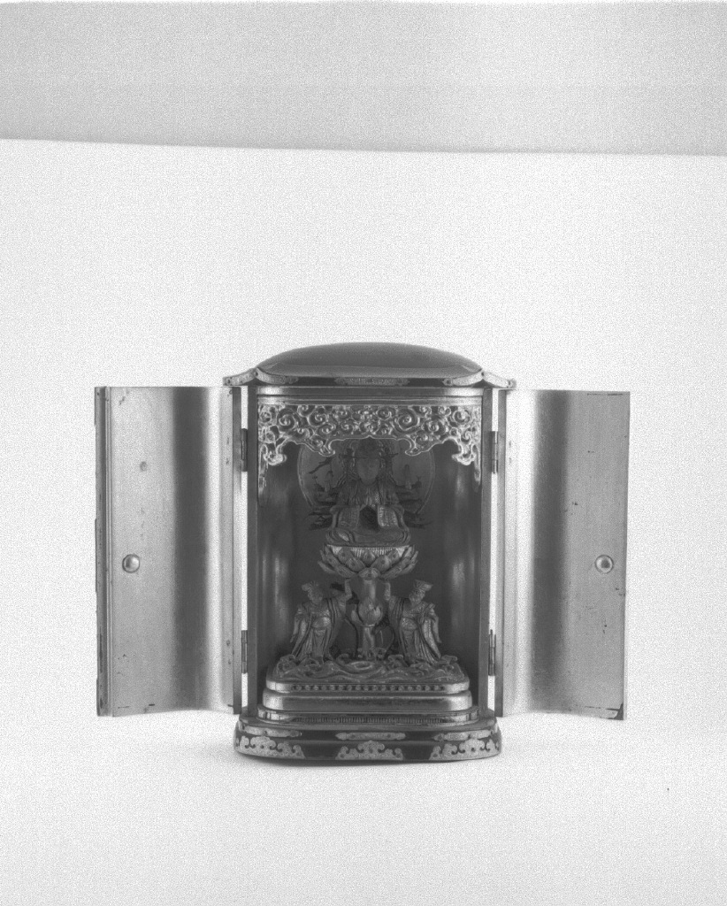 Altarino domestico portatile per divinità buddista. Di forma rettangolare bombata, ha la copertura a forma di pagoda. Decorato esternamente con elaborate placche dorate sulle ante che riproducono motivi vegetali e spirali. L'interno, oltre una cornice decorata, ospita un gruppo scultoreo