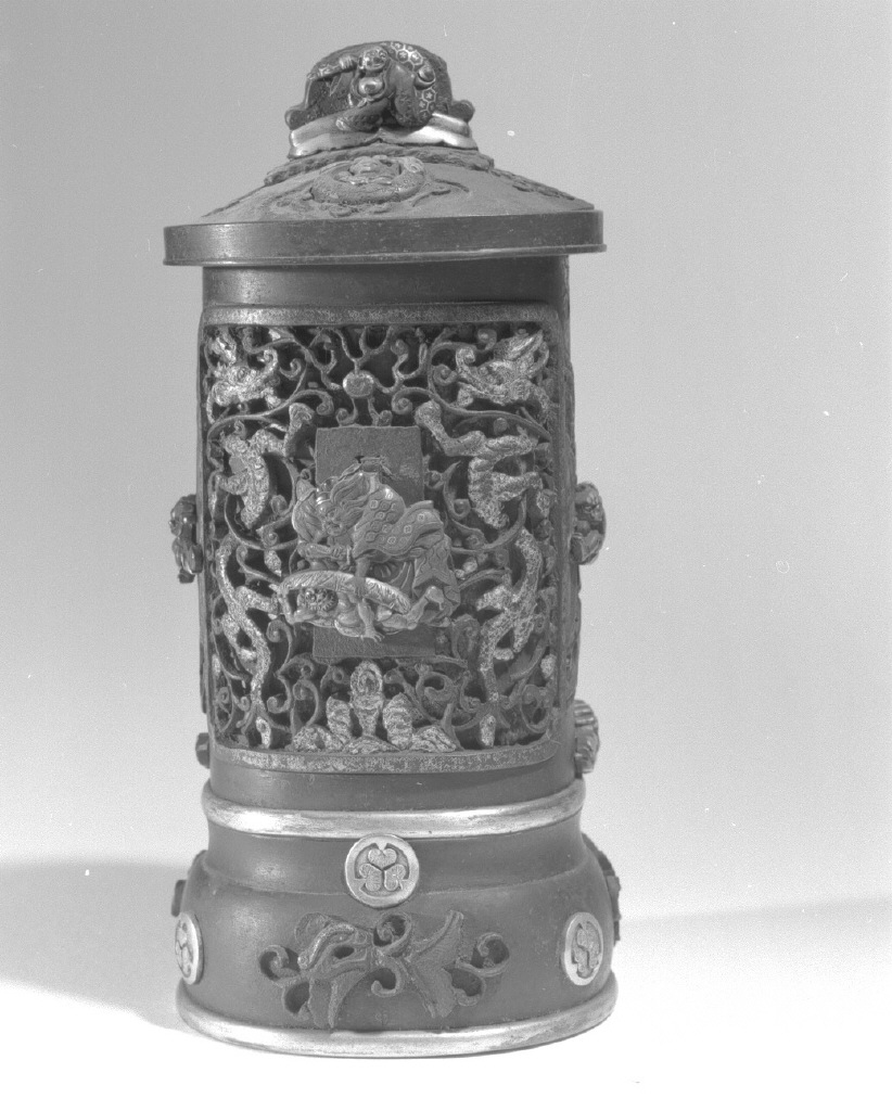 Altarino domestico di divinità buddista di forma cilindrica. La base ha una complessa decorazione zoomorfa a rilievo, la copertura è a tetto di pagoda con mascherone all'apice. Le ante e la parte posteriore sono interamente intagliate e traforate con decorazioni figurate e a volute vegetali
