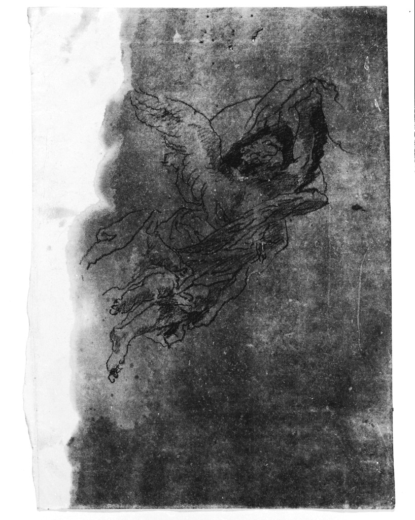 - NOTIZIE STORICO CRITICHE La carta appare oliata in larga misura, fatto che rende molto difficile la lettura del disegno e di conseguenza la certezza dell'autografia. Il soggetto, un angelo in volo, si ritrova in molte composizioni pittoriche di Giovan Battista Pittoni, secondo fattezze e atteggiamenti simili. Ancora una volta si tratta di un ricalco, dal segno meccanico e incerto, ripreso da una composizione pittoniana. Il soggetto, un angelo in volo, nella posizione dei piedi, della testa, delle ali si ritrova in molte composizioni pittoriche di Giovan Battista secondo fattezze e atteggiamenti simili, quali l'angelo in volo dipinto nel Martirio di sant'Orsola della chiesa di Sant'Orsola a Brescia (fig. 52)