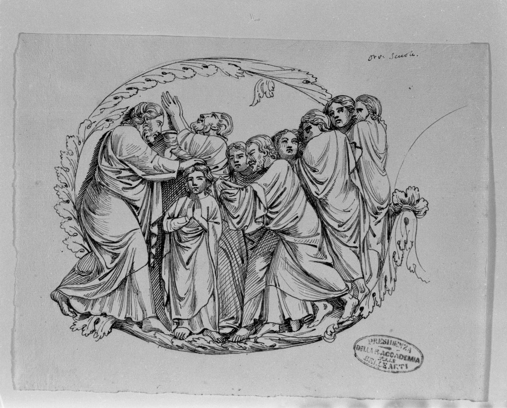 - NOTIZIE STORICO CRITICHE Dal secondo pilastro della facciata del Duomo di Orvieto raffigurante l'Albero di Jesse Pierre David copia nel 1792-93 il primo ovale a sinistra della terza riga dal basso raffigurante l'Unzione di David. Dallo stesso pilastro riprende un alto episodio nei fogli nn.1250 e 1286, e altri sempre dai rilievi della facciata (nn. 1248, 1249, 1285, 1286, 1287, 1288, 1290, 1291). Notava la Petrioli come anche in questo caso sia massimo l'impegno del copista nel non tradire l'essenza formale del modello, e si evidenzi sia "nel ritmico inserirvisi del gruppo nella cornice [ ... ], sia nel robusto plasticismo coadiuvato da un intenso partito chiaroscurale, con cui le figure staccano sul piano di fondo"