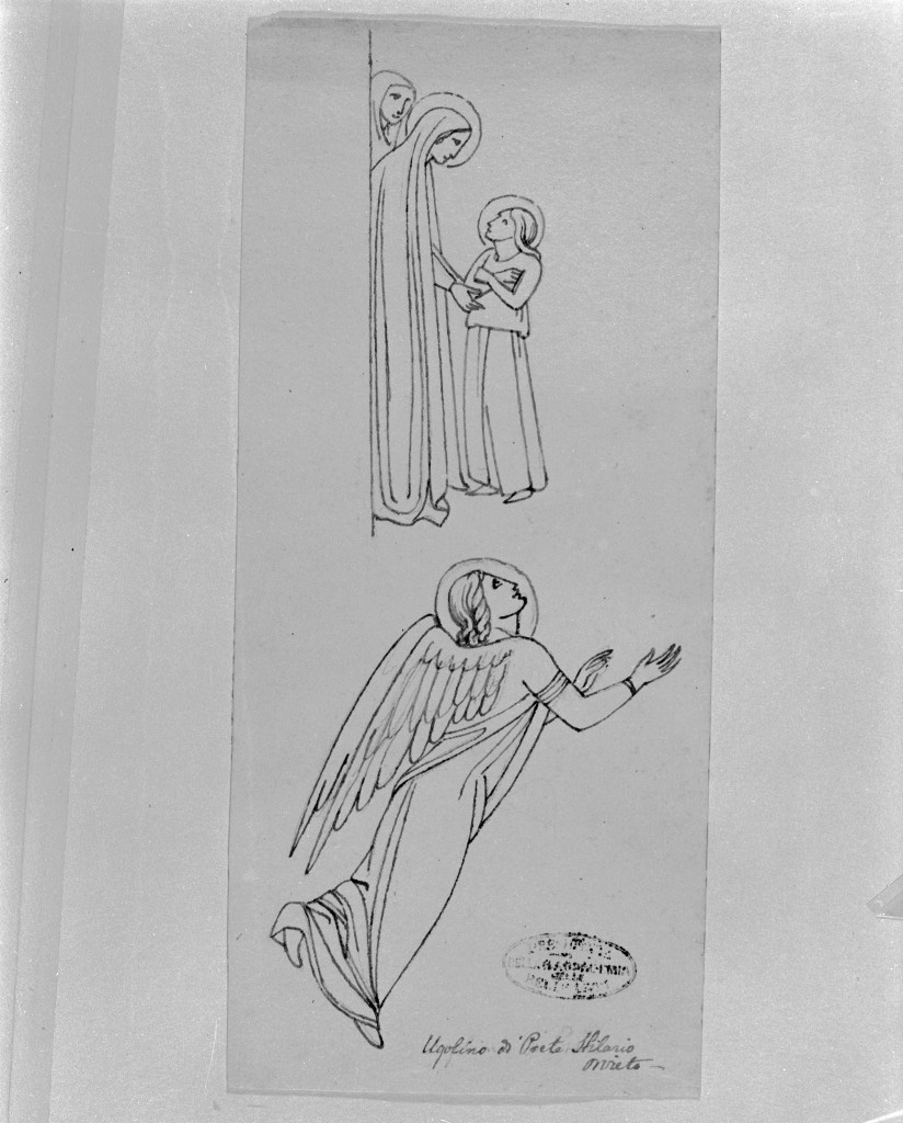 - NOTIZIE STORICO CRITICHE Durante la sosta a Orvieto avvenuta entro il 1793, Pierre David rivolge la sua attenzione anche all'interno del Duomo, in particolare alla cappella del Santissimo Corporale. Dagli affreschi di Ugolino di Prete Ilario trae, infatti, le figure della Vergine e dell'angelo, come indicavano già H Previtali e la Petrioli sulla scorta di quanto lo stesso artista annotava sul foglio, in particolare dalla scena raffigurante il "Ritorno di Gesù dai genitori dopo la discussione con i dottori", a cui si ispira anche per gli studi del n. 1236