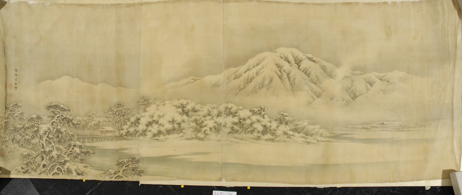 Solo honshi, parte principale di dipinto su seta orizzontale (makimono),che reca una vistosa cucitura nel mezzo come se in passato fosse statosmontato dalla sua originaria montatura, tagliato a metà e poiripristinato con poca accortezza in un secondo momento