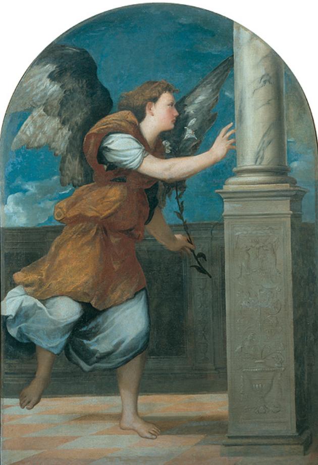 - NOTIZIE STORICO CRITICHE Con la Madonna Annunciata formavano originariamente un un ico dipinto a tre arcate, comprendente anche il "Padre eterno", decurtato ed esposto separatamente nelle Gallerie (inv.n. 917). La manomissione avv enne in epoca imprecisata, ma dopo il 1808, quando nell' "Elenco degli ogg etti di Belle Arti scelti a disposizione di S.A.I. Eugenio Napoleone" veni va ancora indicato come un pezzo solo (Moschini Marconi 1962). Il trittico era stato restaurato anche nel 1782 sotto la direzione dello stesso Edwar ds. Si trovava originariamente nel Magistrato della Camera degli Imprestid i nel Palazzo dei Camerlenghi a Rialto, sulla parete a destra entrando, di fronte alla "Moltiplicazione dei pani" (Gallerie, inv. n. 1293), con ai l ati i "Santi Pietro e Antonio da Padova" (Gallerie, inv. n. 1261) e "Domen ico, Faustino e Alessandro", perduto, della bottega di Bonifacio. Il compl esso fu trasferito a Vienna dal 1816 al 1919; dopo la restituzione i tre p ezzi furono esposti alle Gallerie, l' "Angelo annunciante" e la "Vergine" fino al 1988. Secondo il Ludwig (1901 e 1903) dovrebbe essere stato esegui to per conto di un gruppo di magistrati usciti di carica tra l'1 e il 17 d icembre 1544. Effettivamente nella parte centrale dove è raffigurata una v eduta parziale di piazza San Marco, è già presente la Loggetta, compiuta d al Sansovino nel 1540, anno che diventa quindi il termine post quem per la datazione dell'opera, che dovrebbe essere stata realizzata appunto verso il 1543-44. La Westphal (1931) ha individuato nel1'incisione di Marcantoni o Raimondi dell'"Annunciazione" di Raffaello il modello per la composizion e. Tuttavia vi sono anche altre suggestioni, ad esempio dall'"Annunciazion e" tizianesca della Scuola di San Rocco. Non è chiaro il significato del s oggetto nel contesto della Camera degli Imprestidi, praticamente una banca di Stato, forse in rapporto con una particolare devozione per la Vergine dei funzionari in carica. Purtroppo ogni considerazione sui dipinti è cond izionata oggi dalle manomissioni subite e dal grave depauperamento della s uperficie. Ciononostante tutte e tre le parti appaiono realizzate con raff inata scioltezza pittorica