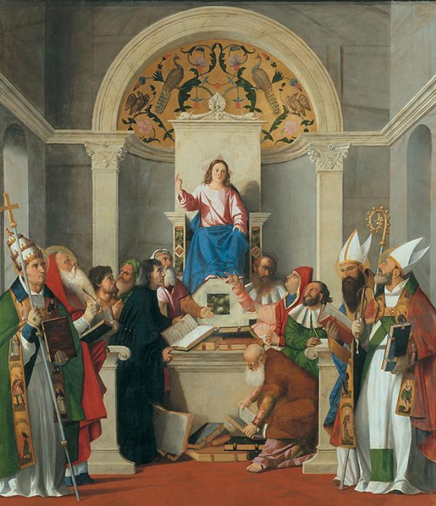 - NOTIZIE STORICO CRITICHE Restaurato nel 1829 da A. Martinolli e nel 1839 da A. Brancaleon, ha subit o successivamente numerosi interventi manutentori, l'ultimo dei quali ha r ecuperato nel pavimento l'originaria colorazione rossa. Giunse alle Galler ie nel 1816 come legato di Girolamo Molin. Vi è raffigurato il famoso pass o del Vangelo di Luca (2,46): Gesù dodicenne, recatosi a Gerusalemme con l a Madre e Giuseppe per la festa di Pasqua, invece di tornare a Nazareth co i genitori rimane nel tempio, dove essi lo ritrovano intento a discutere c oi dottori. Ai lati degli astanti che lo circondano sono raffigurati i qu attro dottori della chiesa: a sinistra Gregorio e Girolamo, a destra Agost ino e Ambrogio, quasi a significare l'attualità dell'insegnamento del Cris to attraverso i secoli. L'attribuzione del dipinto è molto controversa. Ne i più antichi cataloghi (1817-87) veniva indicato come opera di Giovanni d a Udine. Fu in seguito attribuito dal Della Rovere (1888), seguito dal Bot ti (1891) e dal Conti (1895) a Girolamo Pennacchi, allora e tuttora confus o con Girolamo di Bartolomeo Strazzaroli di Aviano. Dal catalogo del Paole tti (1903), dai successivi e dal Borenius (1912) venne assegnato a Pier Ma ria Pennacchi, mentre per il Berenson (1957) appartiene a Palma il Vecchio ma è stato terminato da Girolamo da Santacroce. Opinione parzialmente acc olta nel catalogo del 1949 dalla Marconi, secondo la quale si tratterebbe di scuola del Palma. Tuttavia nel 1962 la Moschini Marconi riteneva che qu este opinioni andassero riviste alla luce del carattere provinciale della tavola, che è stata più recentemente attribuita (Lucco 1978, 1988) anche a Giovanni e Bernardino da Asola. Forse è questa l'ipotesi più convincente allo stato degli studi, ipotesi che spiegherebbe l'effettiva diversità del la morbida figura di Gesù imberbe e le marcate caratterizzazioni fisionomi che, l'incisività del segno nei personaggi che lo attorniano. Si tratta co munque di un artista portatore di una composita cultura figurativa, che co mprende la conoscenza di Giovanni Bellini, del Carpaccio di San Giobbe, fo rse anche di Giovanni Agostino da Lodi, di Palma il Vecchio, di Pier Maria Pennacchi, del giovane Tiziano e che infine ha senz'altro visto la pala c on la "Madonna e santi" di Gian Girolamo Savoldo e Fra' Marco Pensaben a San Nicolò di Treviso
