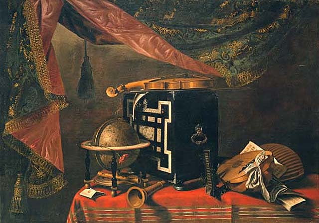 Strumenti musicali: flauto dolce; clarinetto; liuti; mandolino. Oggetti: t avolo; mappamondo. Interno
