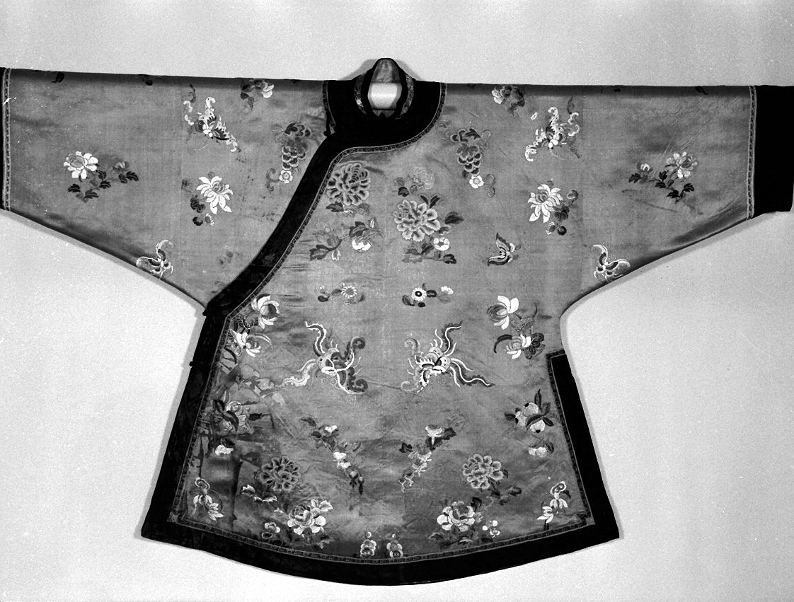 - NOTIZIE STORICO CRITICHE Le donne cinesi prive di rango sociale potevano usare giacche festive rosse del tipo mang ao (cfr.inv.1204/13630) solo in occasione delle cerimonie nuziali, mentre per tutte le altre ricorrenze e cerimonie e festività potevano indossare soprabiti e giacche del tipo qui esaminato, sopra un abito costituito da casacca e gonna a pannelli e plissèè (cfr.in.1164/13781). I motivi ricamati di farfalle, fiori e frutti delle 4 stagioni hanno un significato augurale: accennano a longevità e prosperità felice e diuturna. La stessa fodera in taffetas operato effetto damasco, di colori diversi, è stata impiegata in altri 3 capi della collezione Bardi, rispettivamente un jifu (705/13615), una giacca femminile Han in velluto (1149/13832) ed un gilet femminile manciù (1155/13700): ciò lascia ipotizzare la provenienza dei tre indumenti dal medesimo ambiente o almeno dal medesimo atelier di finitura: è noto peraltro che alla fine dell'epoca Qing esistevano imprese e negozi di vestiario pronto, nonchè di vestiario di seconda mano (cfr.V.Wilson, Chinese Dress, Victoria and Albert Museum, London 1986, pp.99-101). Acquistato in Cina da Enrico di Borbone Conte di Bardi tra ottobre 1888 e febbraio 1889