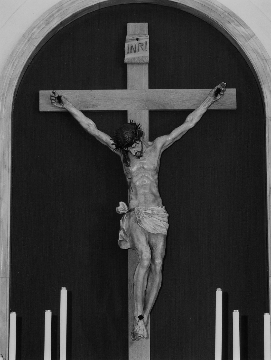 - NOTIZIE STORICO CRITICHE Il Cristo crocifisso è stato collocato sull'altar maggiore dopo i lavori di ampliamento della chiesa nel 1966. Anche l'altare subì alcune modifiche in quell'occasione, tra cui l'asportazione della pala di Pietro Roi che fu sostituita dal crocifisso ligneo prima collocato sulla parete destra della chiesa (G. Sterbini, 1989, p. 205, fig. 21). Il crocifisso è stato collocato su una nuova croce. Le foto d'epoca testimoniano che la croce originaria era scura e ornata di raggi dorati