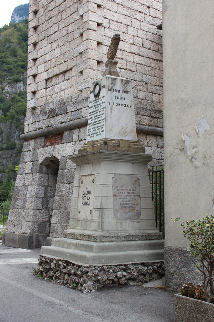 Basso zoccolo quadrangolare costituito da massi di montagna, su cui si elevano due gradini digradanti. Sopra poggia un basamento a tronco di piramide, con cornice aggettante, che mostra su tre lati lapidi con epigrafi. Su di un plinto in pietra sta il cippo, rivestito di lapidi marmoree con iscrizioni e una corona bronzea sul prospetto anteriore. Il monumento termina con una fiamma ardente apicale