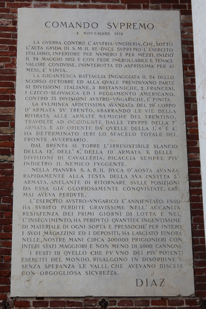 - ISCRIZIONI al centro - COMANDO SVPREMO/ 4 NOVEMBRE 1918/ LA GVERRA CONTRO L’AVSTRIA-VNGHERIA, CHE, SOTTO/ L’ALTA GVIDA DI S. M. IL RE - DVCE SVPREMO - L’ESERCITO/ ITALIANO, INFERIORE PER NVMERO E PER MEZZI, INIZIO’/ IL 24 MAGGIO 1915 E CON FEDE INCROLLABILE E TENACE/ VALORE CONDVSSE, ININTERROTTA ED ASPRISSIMA PER 41/ MESI, E’ VINTA./ LA GIGANTESCA BATTAGLIA INGAGGIATA IL 24 DELLO/ SCORSO OTTOBRE ED ALLA QVALE PRENDEVANO PARTE/ 51 DIVISIONI ITALIANE, 3 BRITANNICHE, 2 FRANCESI,/ 1 CZECO-SLOVACCA ED 1 REGGIMENTO AMERICANO,/ CONTRO 73 DIVISIONI AVSTRO-VNGARICHE, E’ FINITA./ LA FVLMINEA ARDITISSIMA AVANZATA DEL 29° CORPO/ D’ARMATA SV TRENTO, SBARRANDO LE VIE DELLA/ RITIRATA ALLE ARMATE NEMICHE DEL TRENTINO,/ TRAVOLTE AD OCCIDENTE DALLE TRVPPE DELLA 7A/ ARMATA E AD ORIENTE DA QVELLE DELLA 1A, 6A E 4A,/ HA DETERMINATO IERI LO SFACELO TOTALE DEL/ FRONTE AVVERSARIO./ DAL BRENTA AL TORRE L’IRRESISTIBILE SLANCIO/ DELLA 12A, DELL’8A DELLA 10A ARMATA E DELLE/ DIVISIONI DI CAVALLERIA, RICACCIA SEMPRE PIV’/ INDIETRO IL NEMICO FVGGENTE./ NELLA PIANVRA S.A.R. IL DVCA D’AOSTA AVANZA/ RAPIDAMENTE ALLA TESTA DELLA SVA INVITTA 3A/ ARMATA, ANELANTE DI RITORNARE SVLLE POSIZIONI/ DA ESSA GIA’ GLORIOSAMENTE CONQVISATE, CHE/ MAI AVEVA PERDVTE./ L’ESERCITO AVSTRO-VNGARICO E’ ANNIENTATO: ESSO/ HA SVBITO PERDITE GRAVISSIME NELL’ACCANITA/ RESISTENZA DEI PRIMI GIORNI DI LOTTA E NEL/ L’INSEGVIMENTO; HA PERDVTO QVANTITA’ INGENTISSIME/ DI MATERIALE DI OGNI SORTA E PRESSOCHE’ PER INTERO/ I SVOI MAGAZZINI ED I DEPOSITI; HA LASCIATO FINORA/ NELLE NOSTRE MANI CIRCA 300000 PRIGIONIERI CON/ INTERI STATI MAGGIORI E NON MENO DI 5000 CANNONI./ I RESTI DI QVELLO CHE FV VNO DEI PIV’ POTENTI/ ESERCITI DEL MONDO, RISALGONO IN DISORDINE E/ SENZA SPERANZA LE VALLI, CHE AVEVANO DISCESE/ CON ORGOGLIOSA SICVREZZA./ DIAZ - capitale romana, numeri arabi - a incisione - italiano