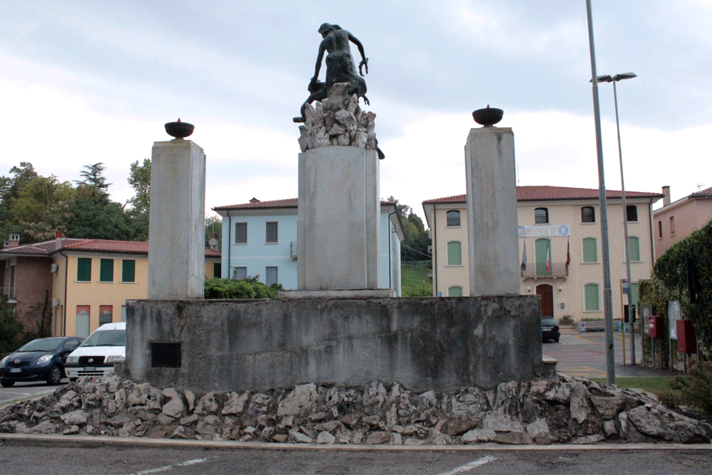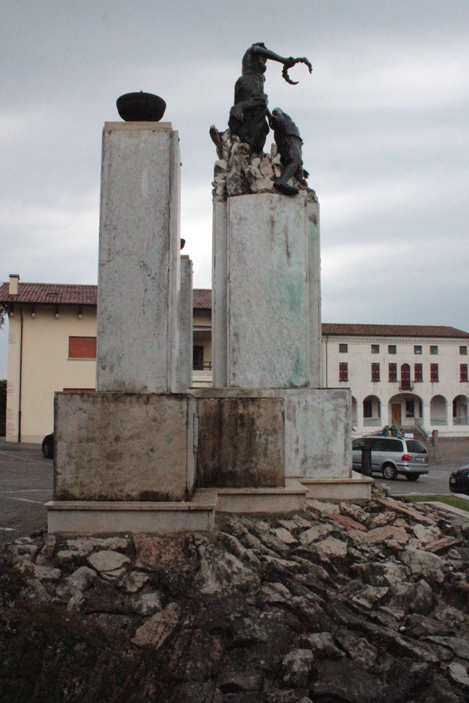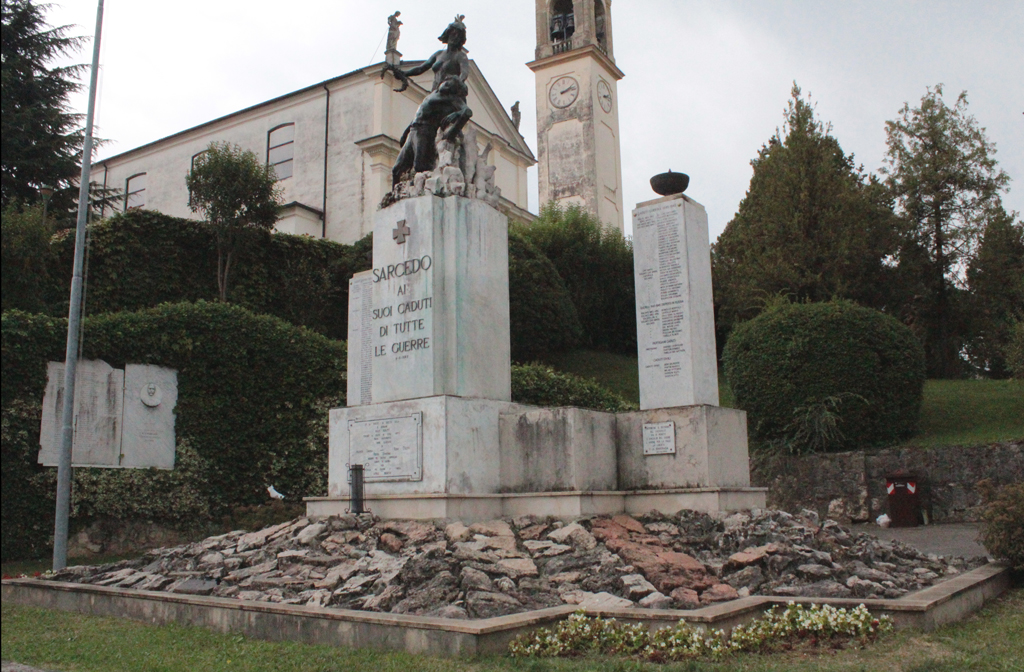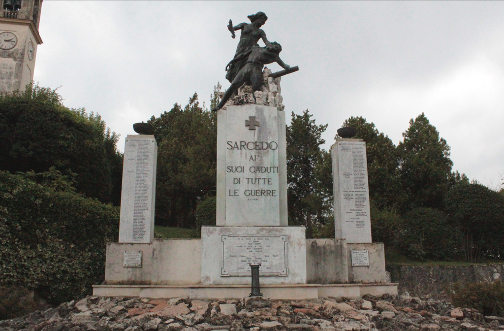 - NOTIZIE STORICO CRITICHE Il progetto di realizzazione del monumento, fortemente sostenuto dal sindaco Francesco Dalle Rive, già capogruppo della locale sezione degli Alpini, risale al 1961-1962. Mancando nel paese una piazza principale, la scelta del luogo deputato alla costruzione del monumento ai caduti di tutte le guerre ricadde sull'area di fronte al Municipio, che però non disponeva dello spazio necessario. Pertanto il Comune approvò una delibera di riqualificazione della zona, che comportò lo sbancamento di una parte della collina che delimitava la piazza dalla parte della chiesa, la creazione di muri di contenimento, e lo spostamento del capitello della Pietà da parte degli Alpini e di genieri americani di stanza a Vicenza. Il monumento, in marmo di Carrara e in bronzo, opera dello scultore Egisto Caldana di Vicenza, venne inaugurato l’8 aprile 1962. Alla cerimonia parteciparono gli Alpini della sezione locale, la popolazione, il Prefetto Nicosia, l’On. Cengherle, l’On. Fornale, il Generale Cunico, il Maggiore Adami, il Maggiore Pesa, il Capitano Milan, i Generali e Ufficiali della Setaf e il Sindaco e Capogruppo Dalle Rive. Ufficiò la SS. Messa il Rev. Padre Faccin. Il discorso di inaugurazione venne pronunciato dall’On. Cengherle. Alla base del monumento venne in seguito ricollocata una lapide commemorativa già nel Municipio e datata 1922. Altre due lapidi, dedicate a Giacomo Chilesotti e alla commemorazione del sacrificio dei caduti, vennero sistemate alle estremità frontali del basamento. Diverse notizie e foto storiche relative alle fasi di cantiere del monumento e alla sua inaugurazione sono in: http://www.gruppoalpinisarcedo.altervista.org/index.php?option=com_content&view=article&id=8&Itemid=147
