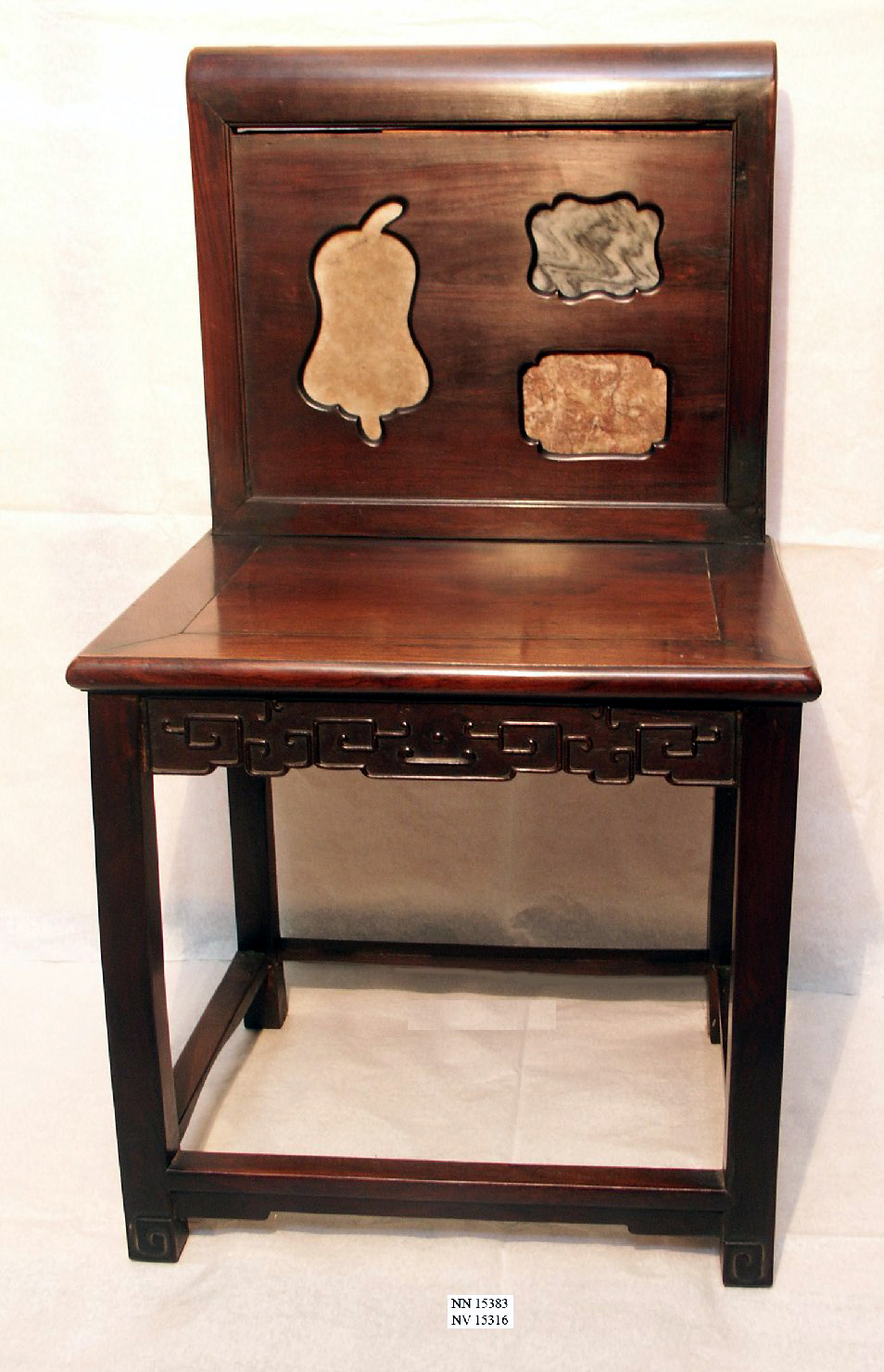 Seduta e schienale quadrangolari. Riquadro con tre inserti in marmo sullo schienale, in tre diversi colori (rosa, verde, bianco) raffiguranri le sagome di vasi. Fronte ornato con motivi a nuvola realizzati a intaglio