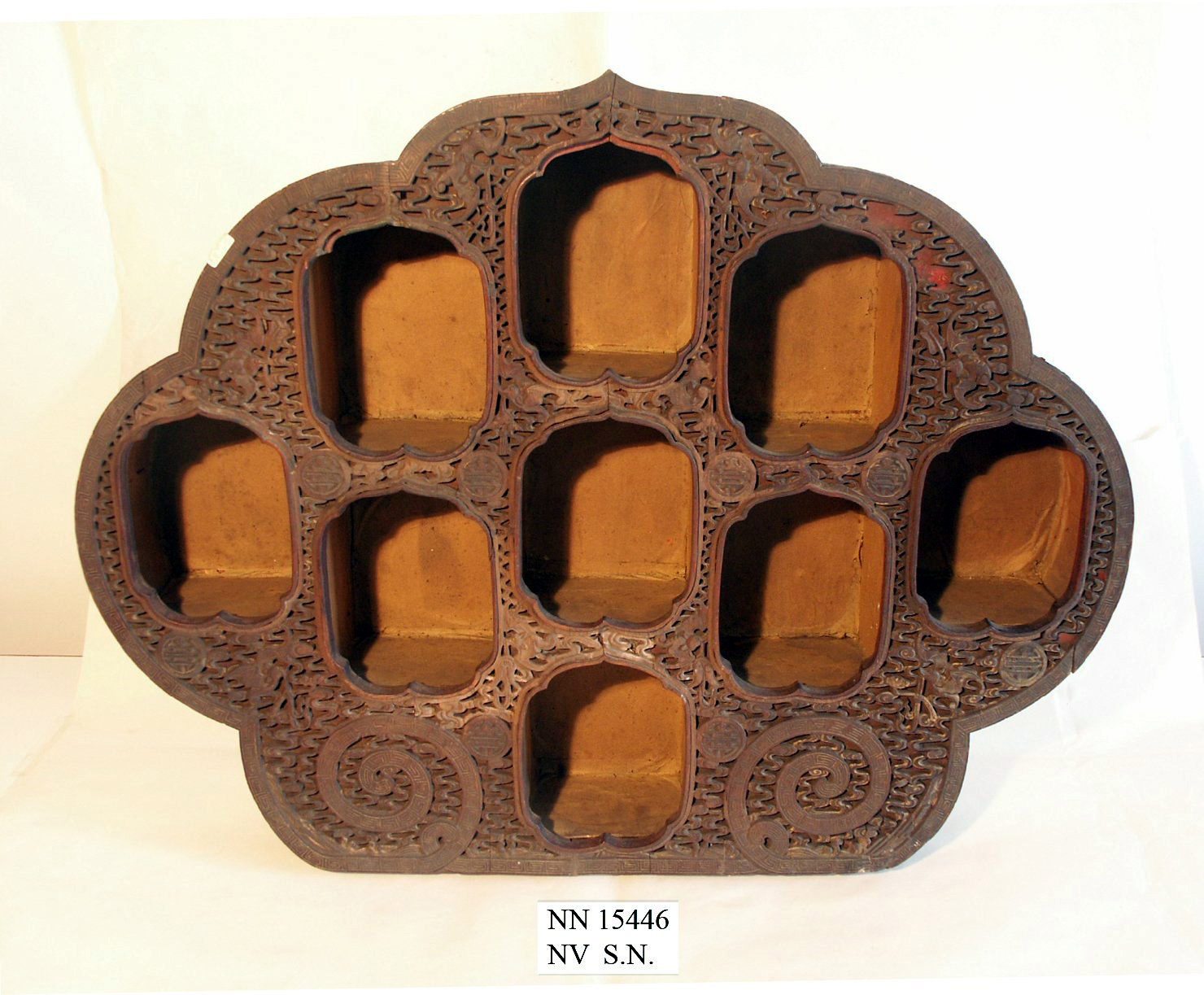 Teca lignea a nove nicchie, di forma lobata con intagli raffiguranti nubi, pipistrelli, leiwen (spirale) a cornice e, sul lato, crisantemi e chang (nodo). Presenti sul fondo, privo di intagli, dei perni. Simile a 15445, lievemente differente la decorazione